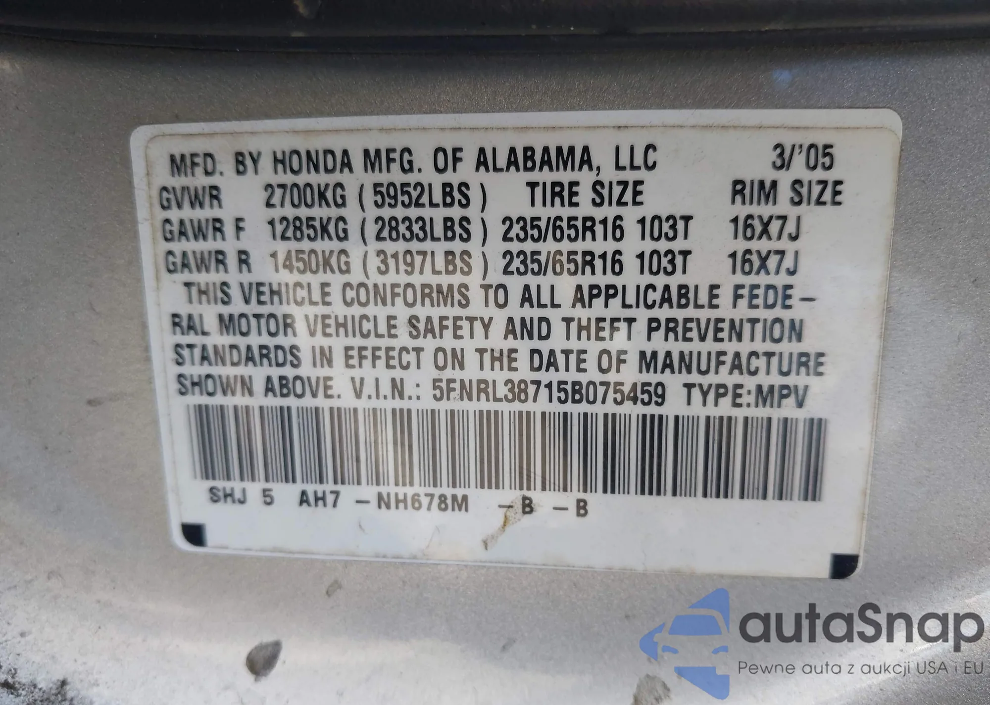 • VIN 5FNRL38715B075459