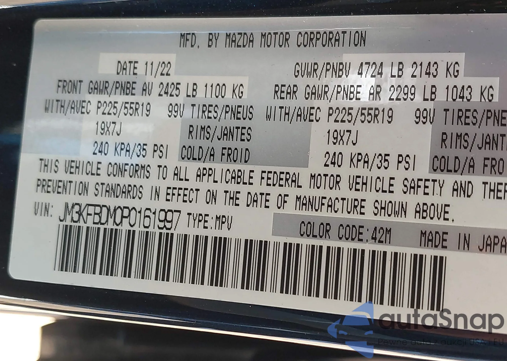 LOT: 43522635 VIN: JM3KFBDM0P0161997