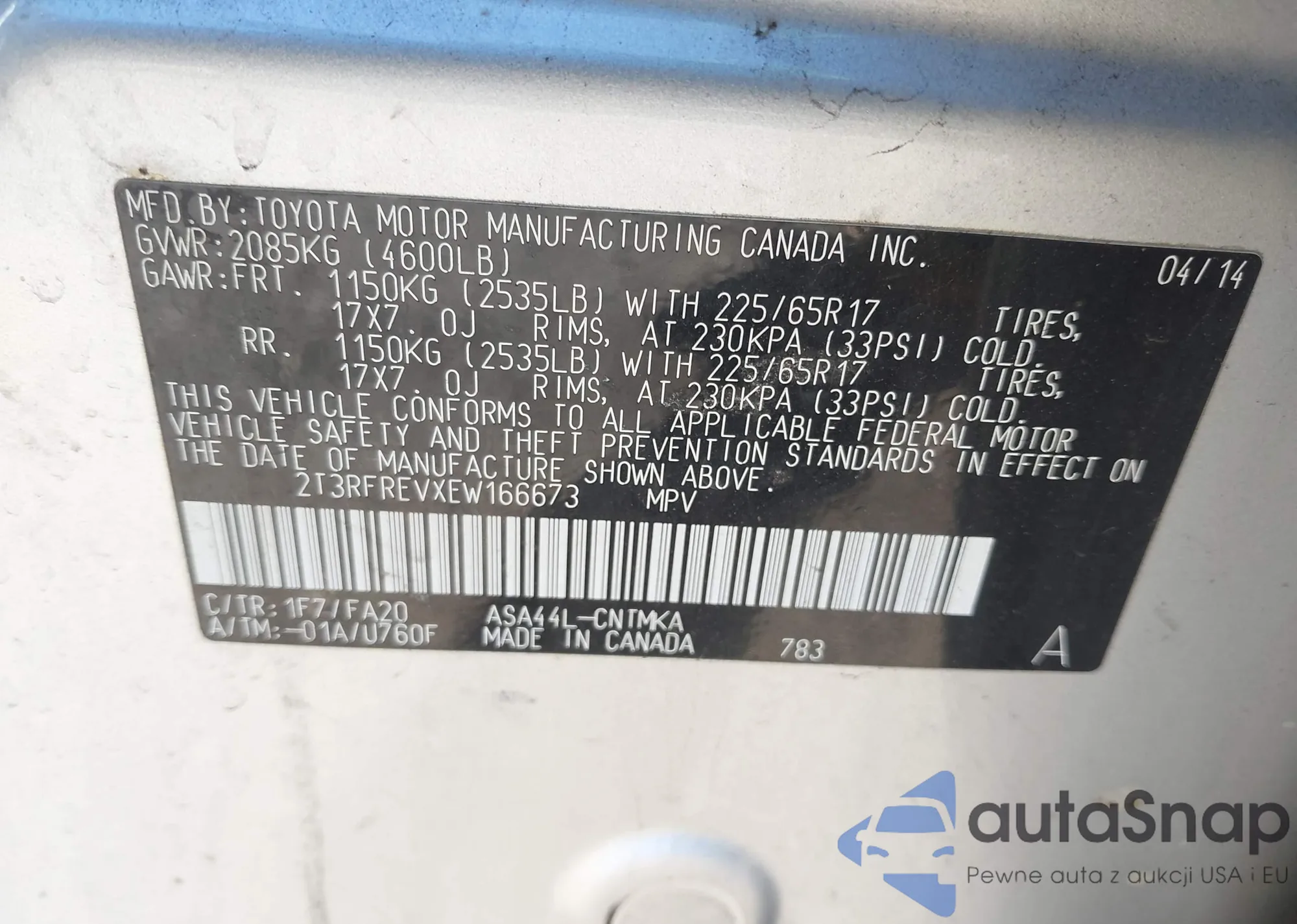 LOT: 43600087 VIN: 2T3RFREVXEW166673