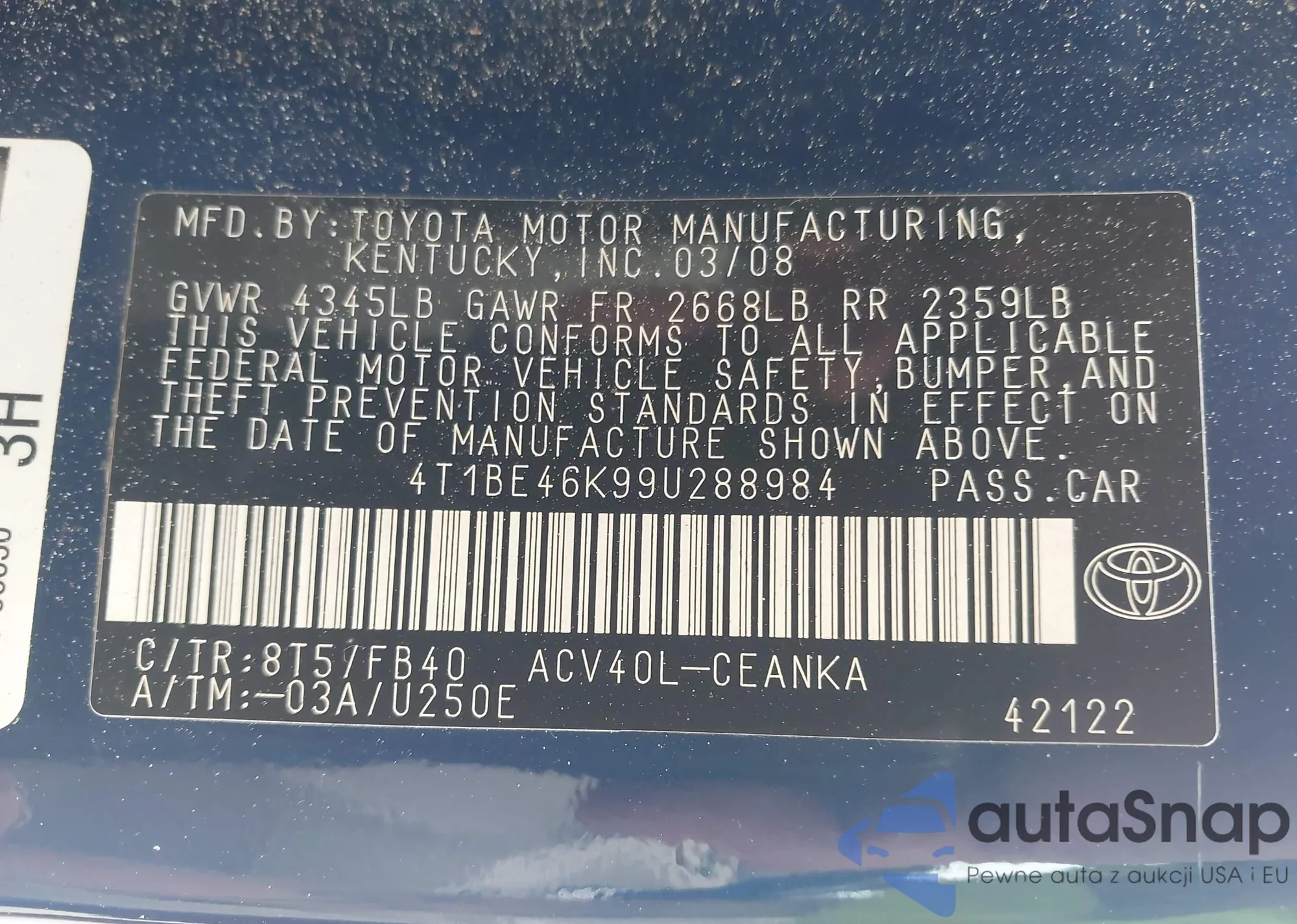 • VIN 4T1BF1FK9HU768971