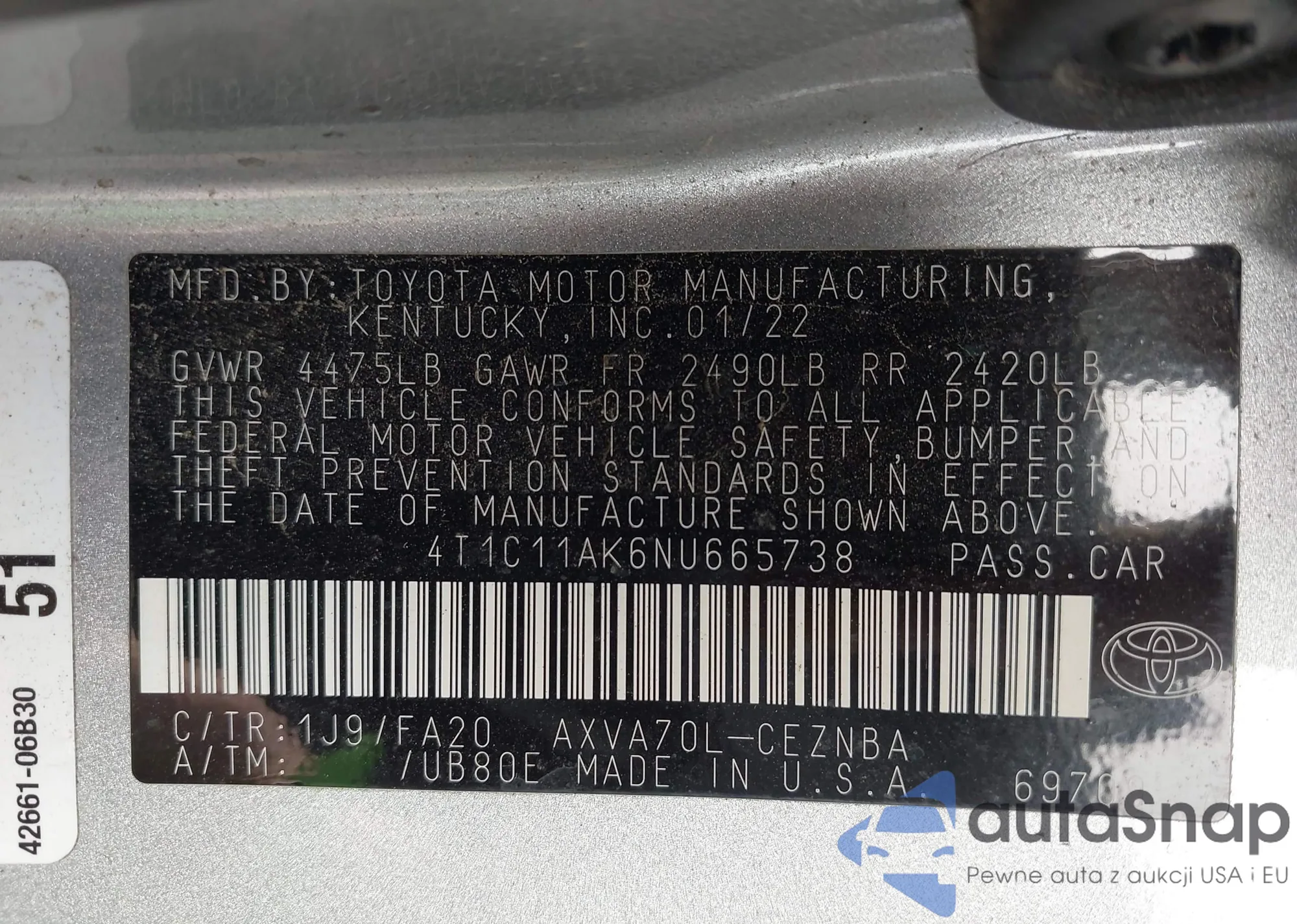 LOT: 43104370 VIN: 4T1C11AK6NU665738