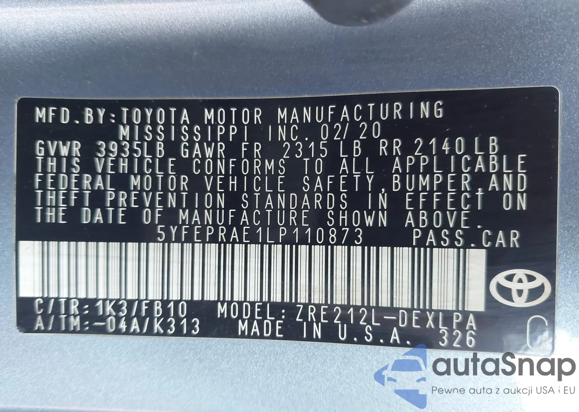 LOT: 43212545 VIN: 5YFEPRAE1LP110873