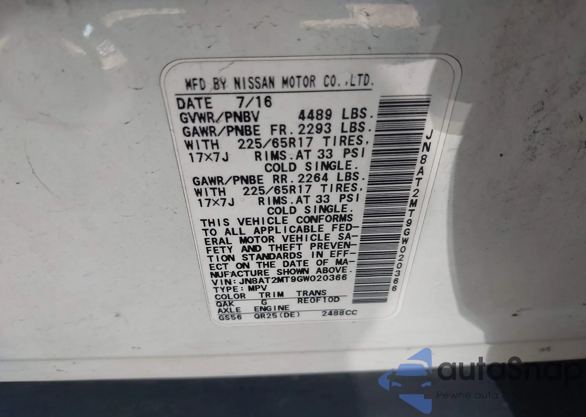 LOT: 43234122 VIN: JN8AT2MT9GW020366