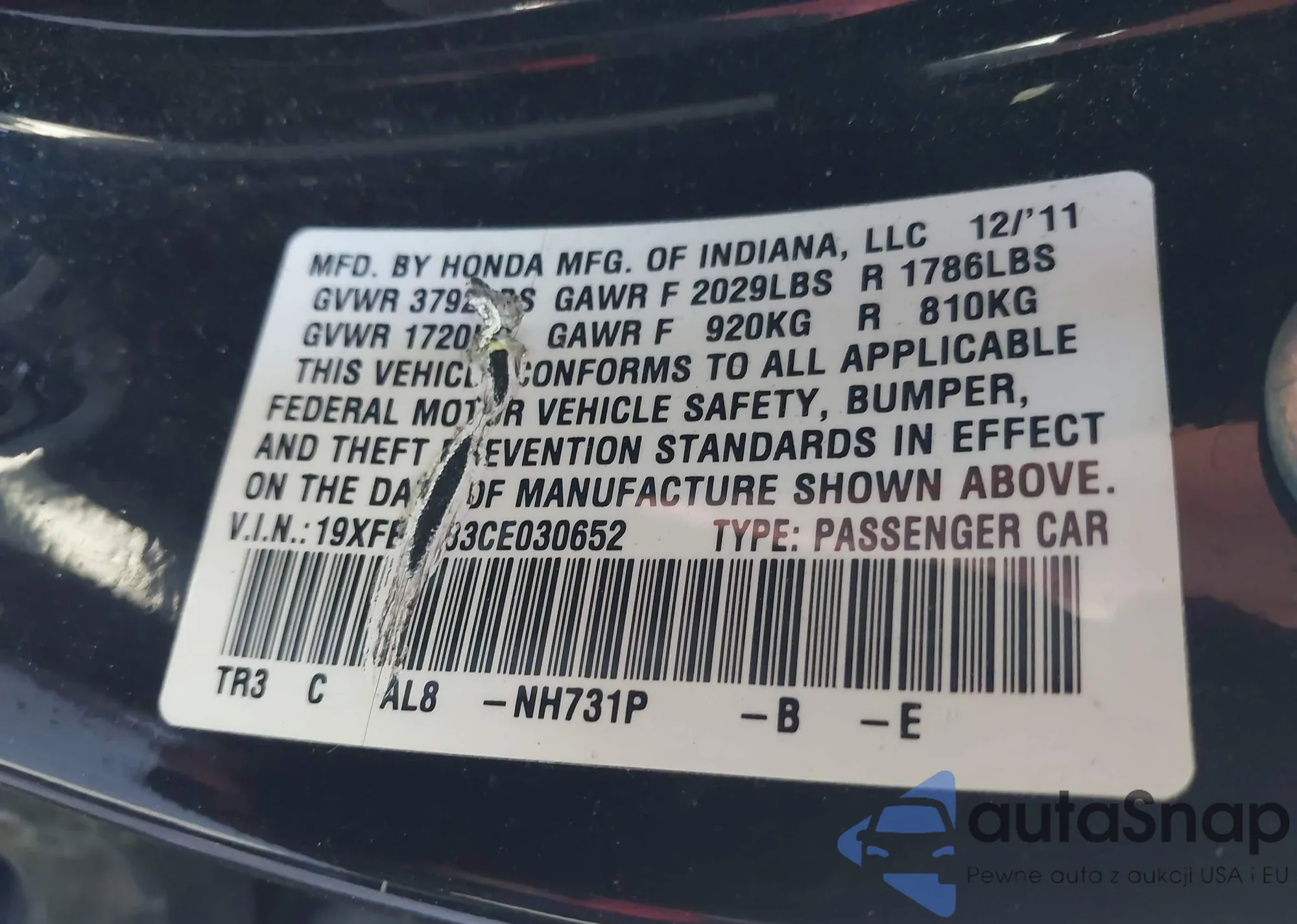 LOT: 43341403 VIN: 19XFB2F83CE030652