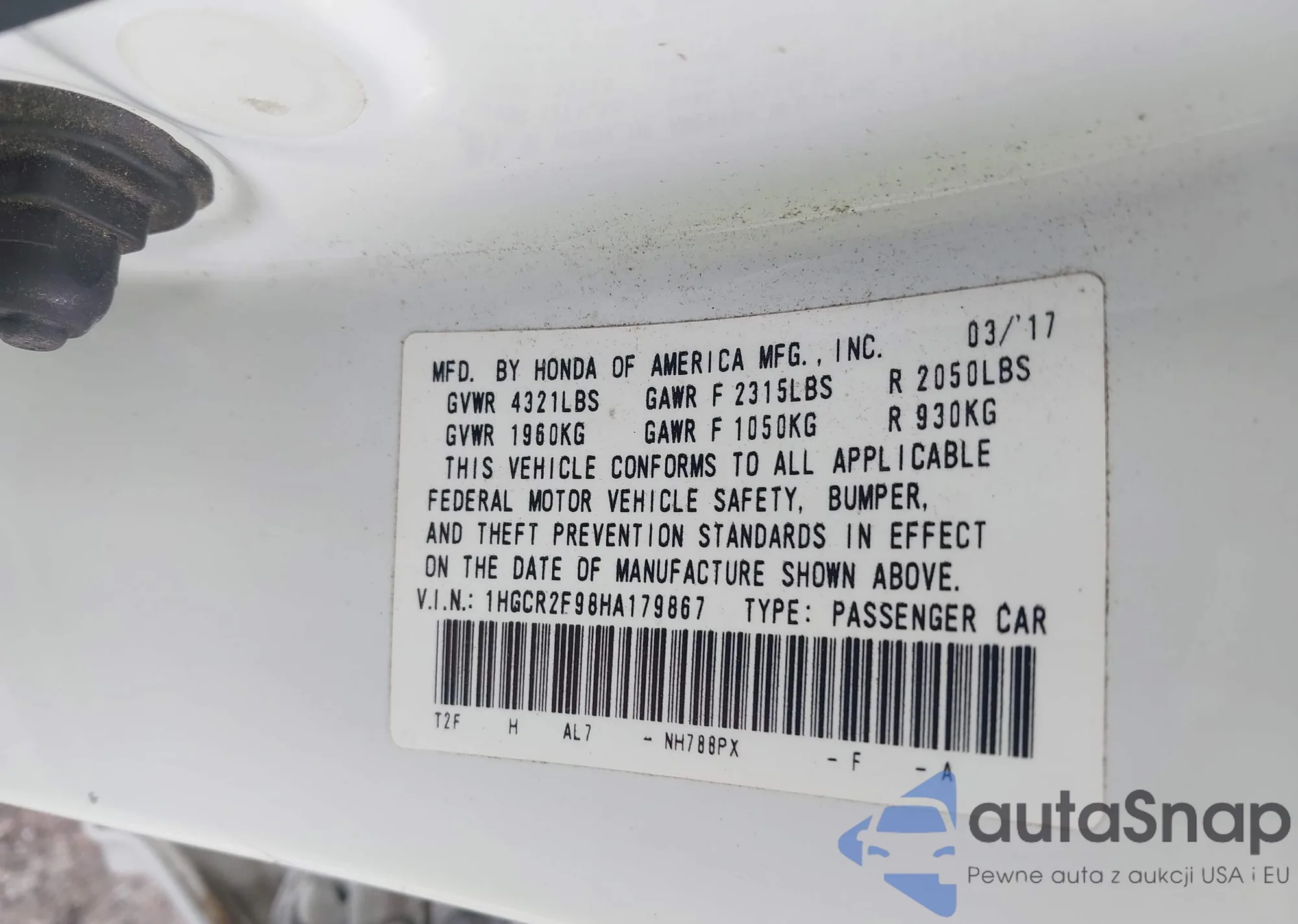 • VIN 1HGCR2F15HA276714