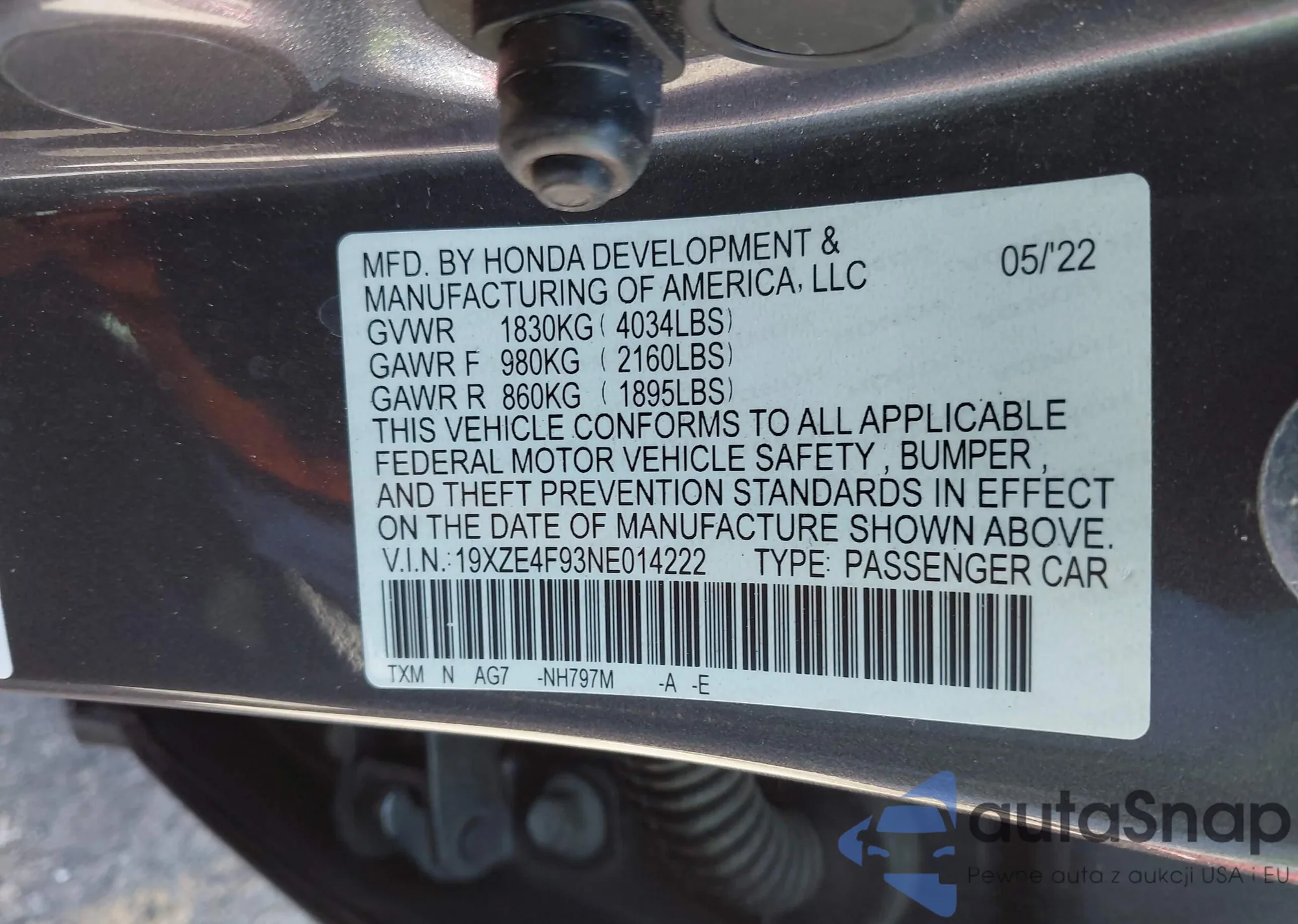 LOT: 43335372 VIN: 19XZE4F93NE014222