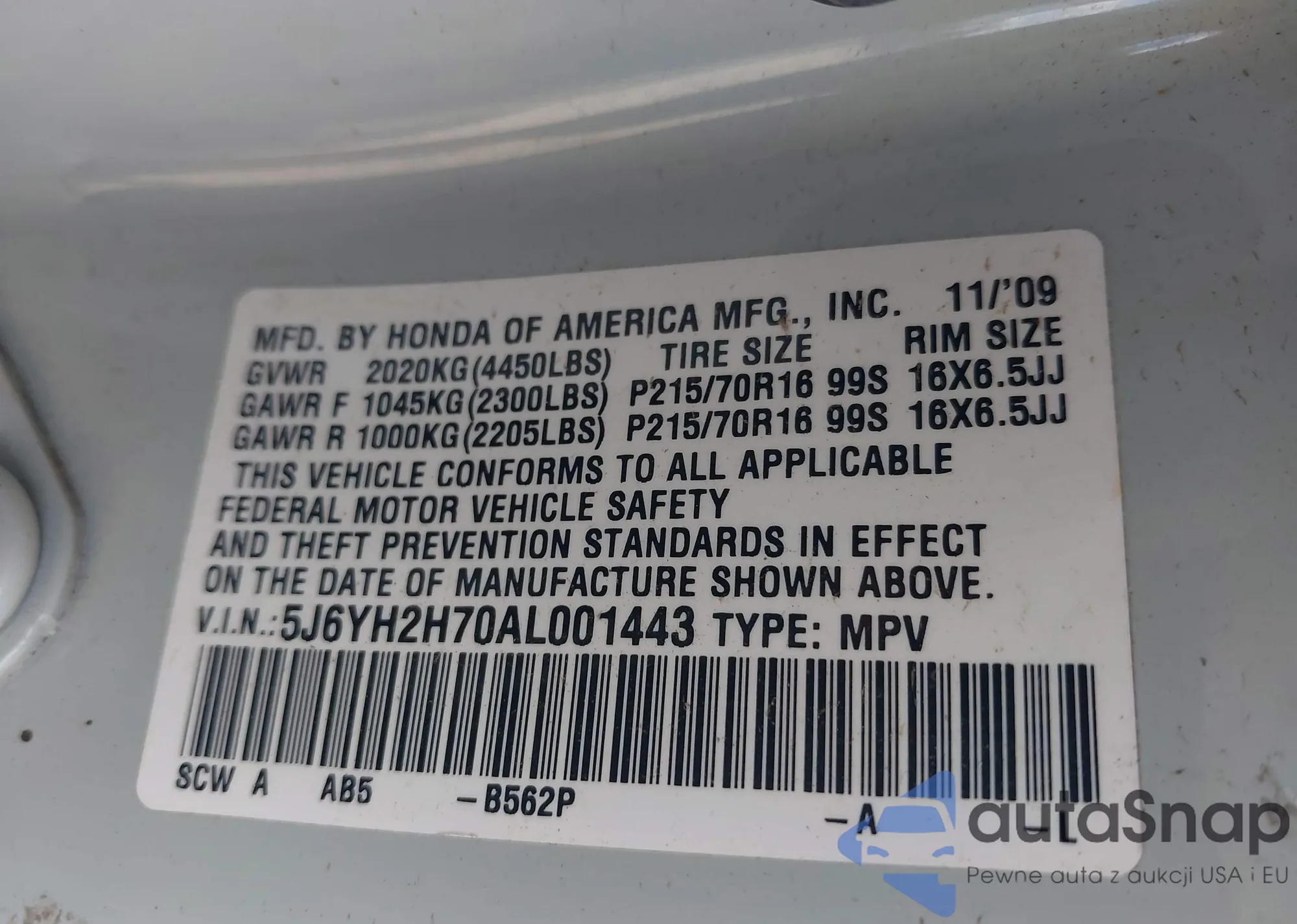 LOT: 43371672 VIN: 1HGCP268X9A027636