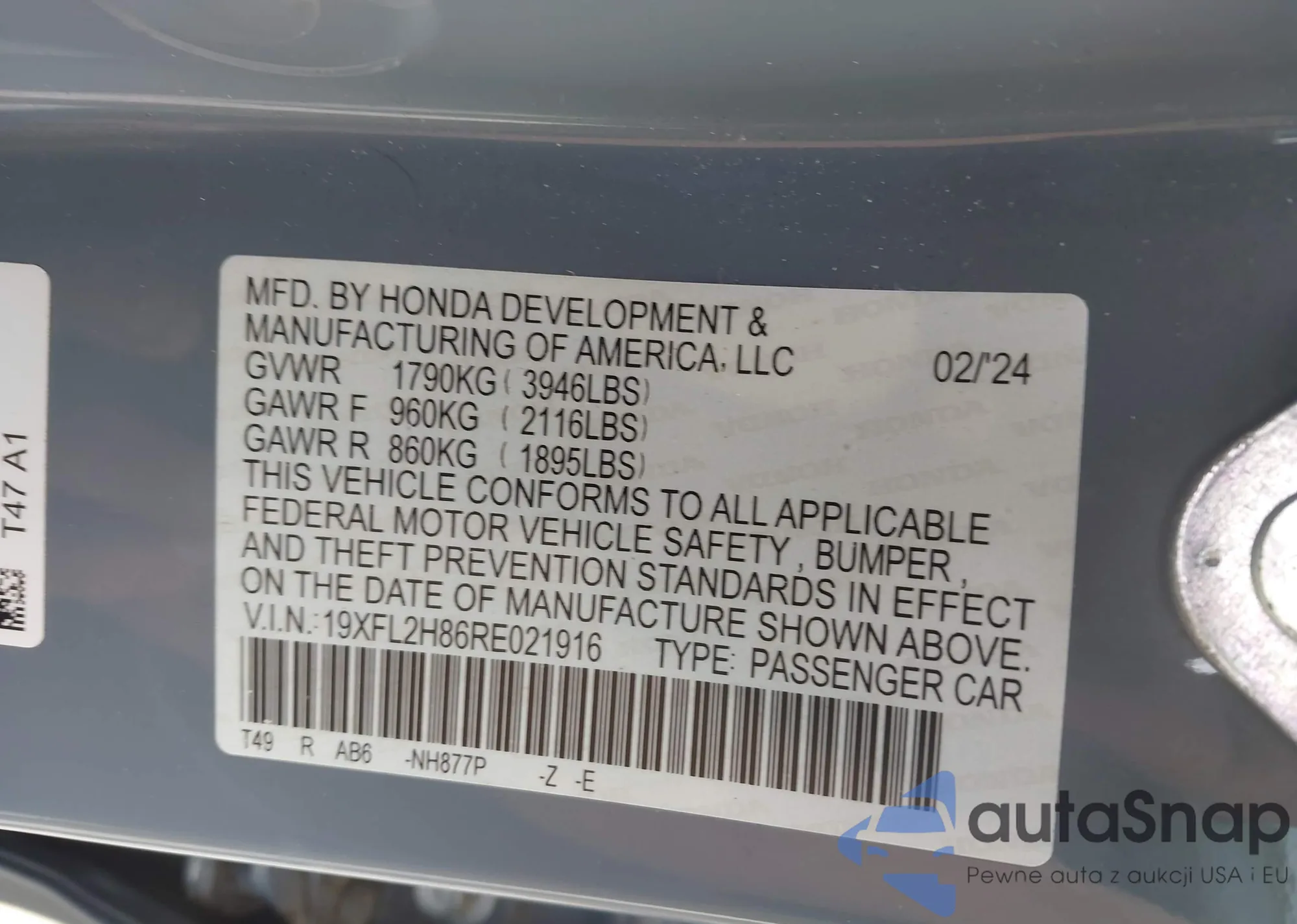 • VIN 19XFL2H86RE021916