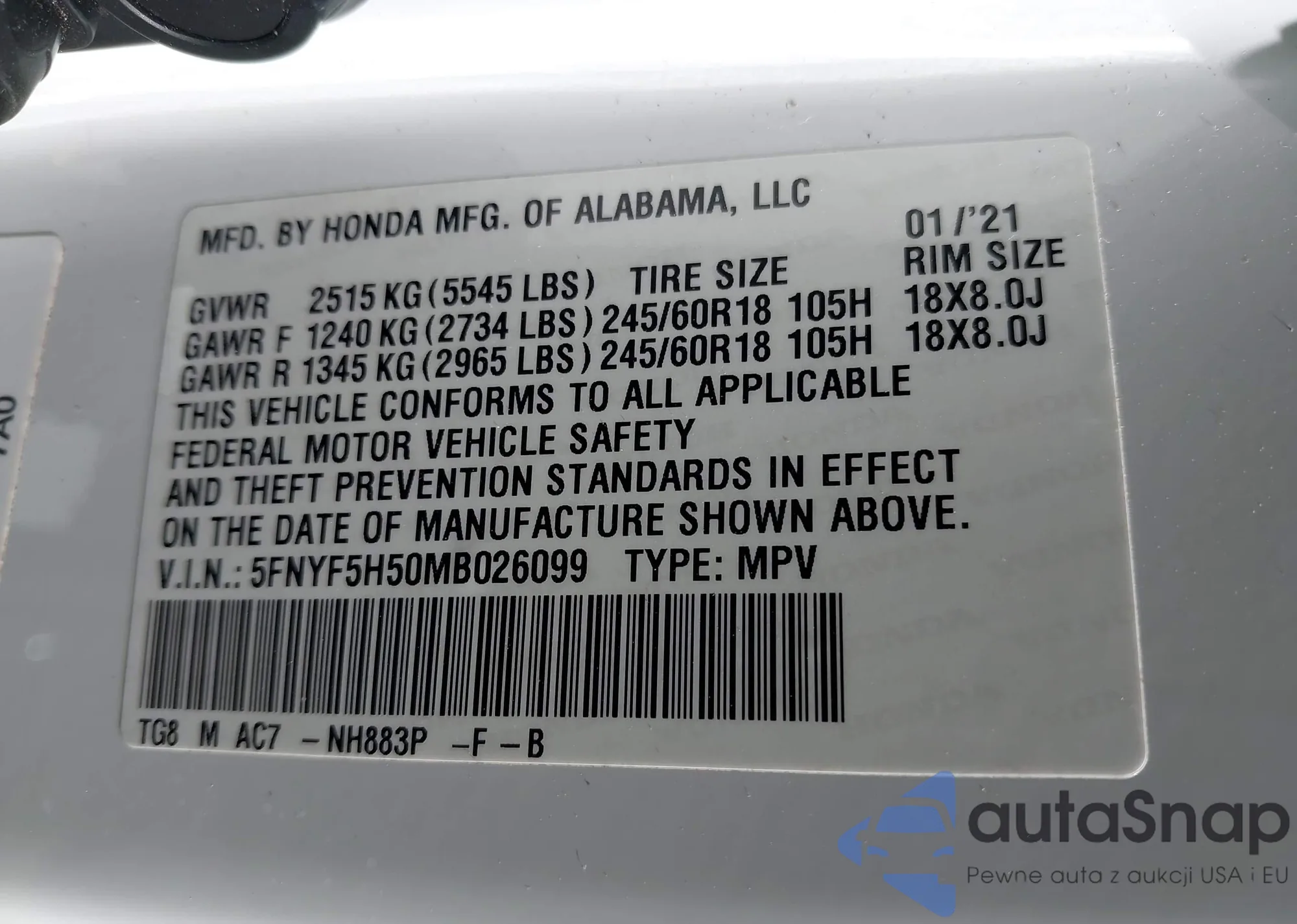 LOT: 43376957 VIN: 3CZRU6H15MM755122