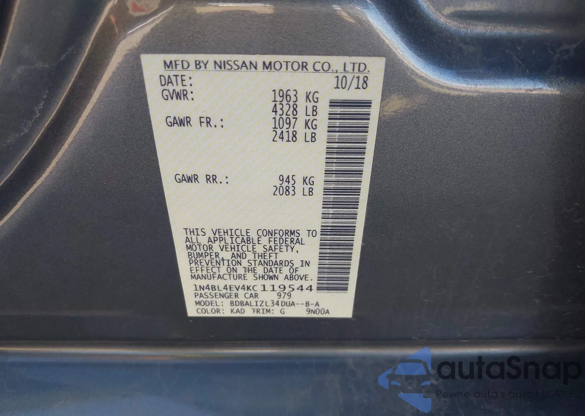 LOT: 43576503 VIN: 1N4BL4EV4KC119544
