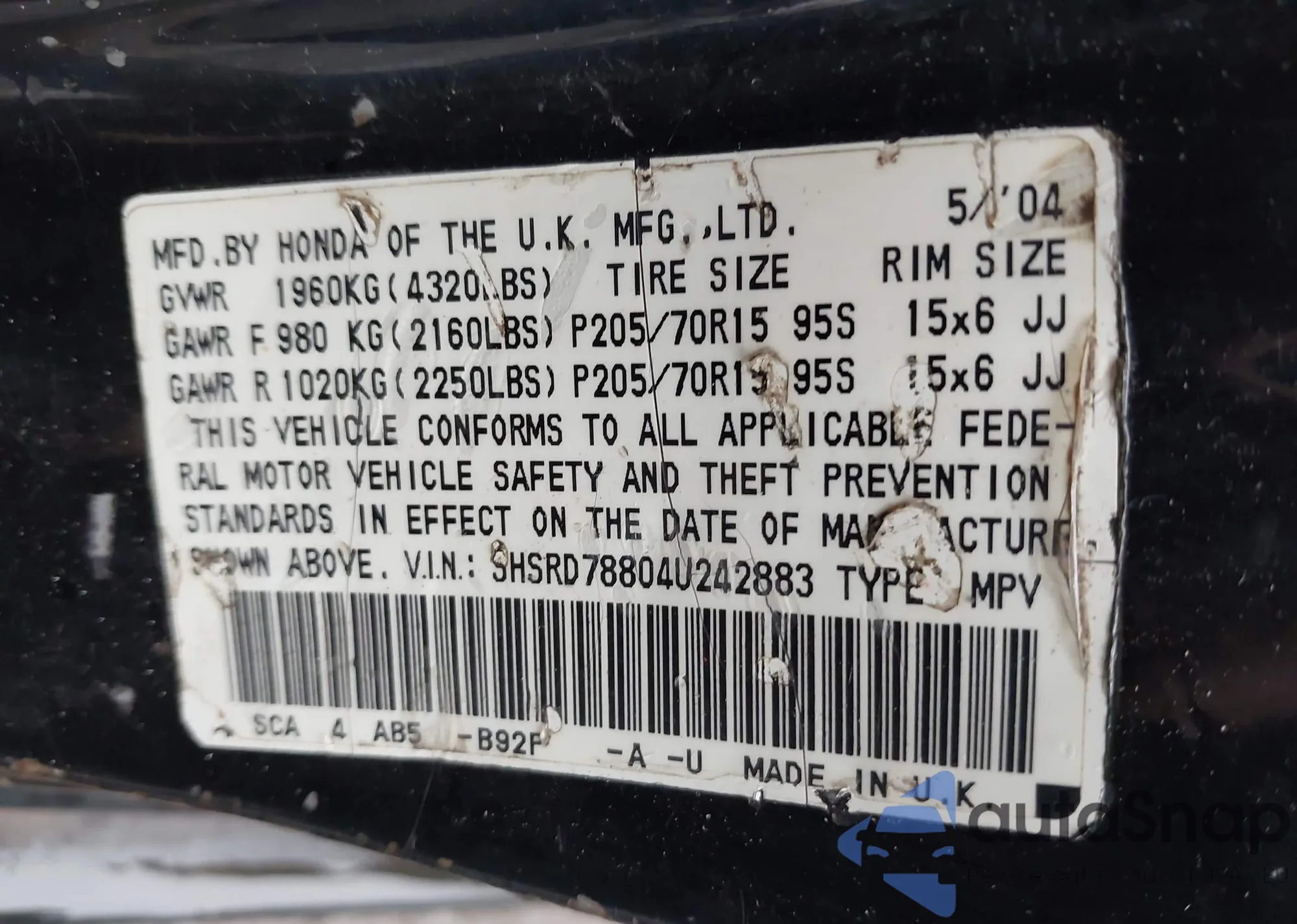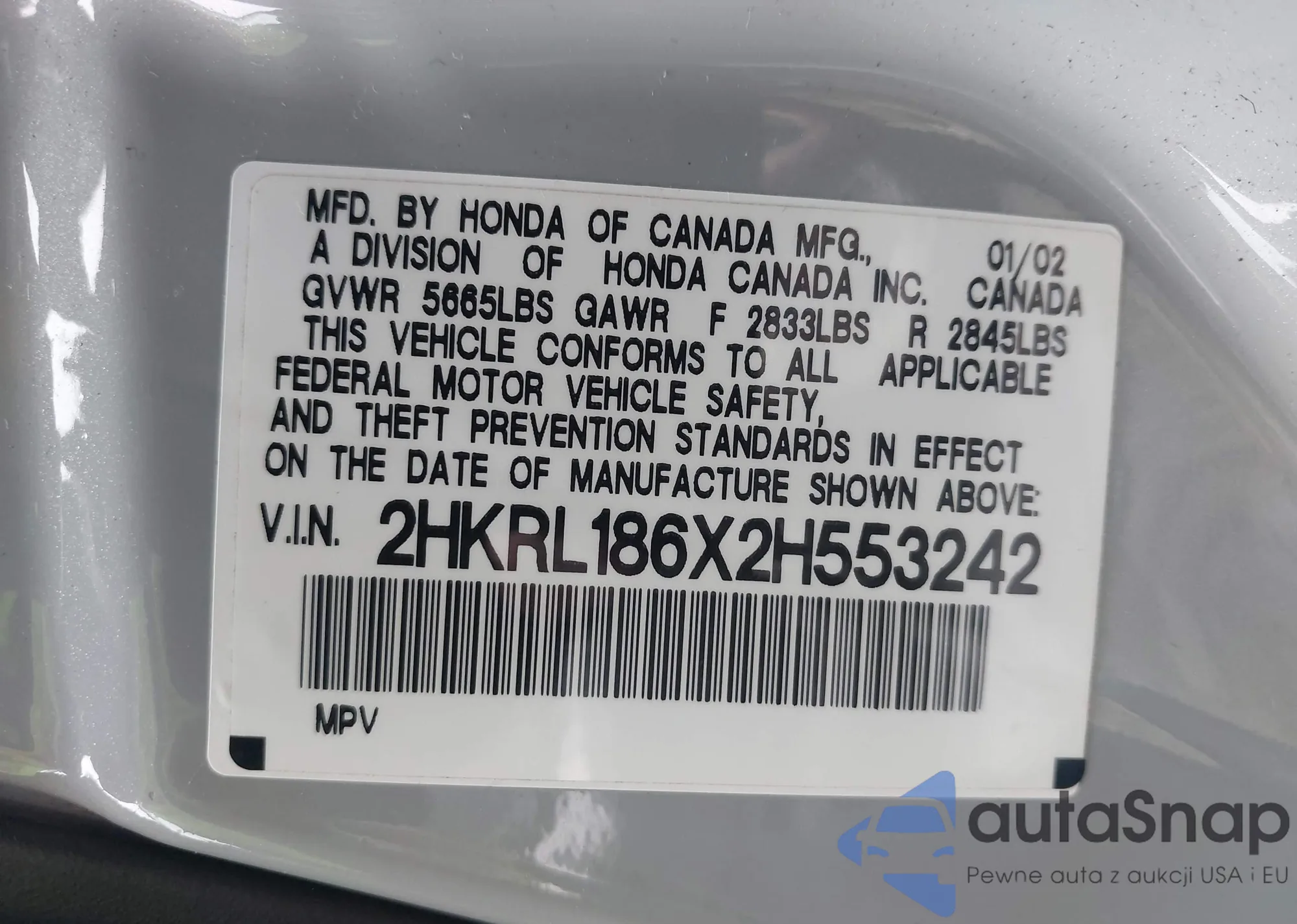 • VIN 2HKRL186X2H553242