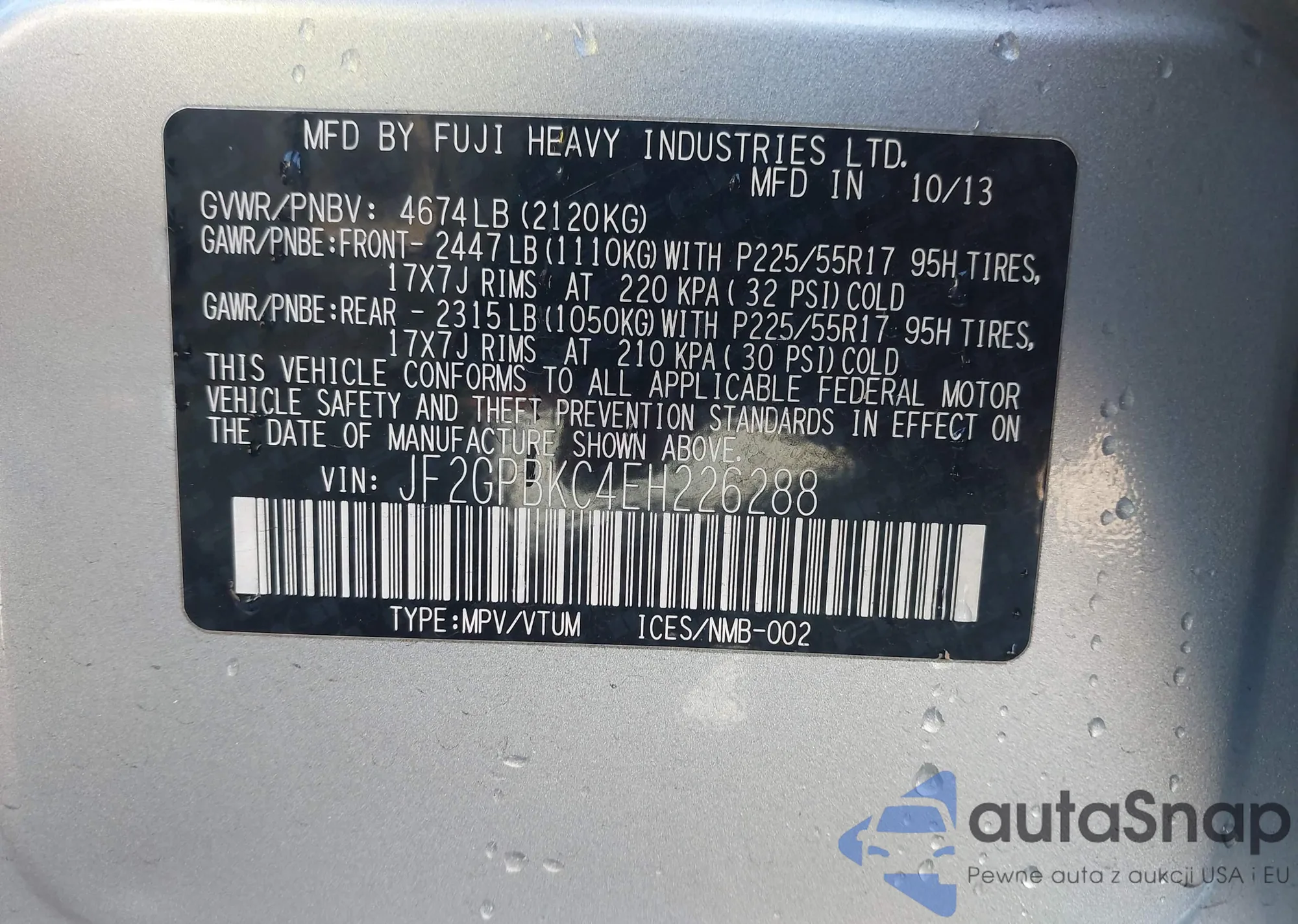 LOT: 43599248 VIN: JF2GPBKC4EH226288