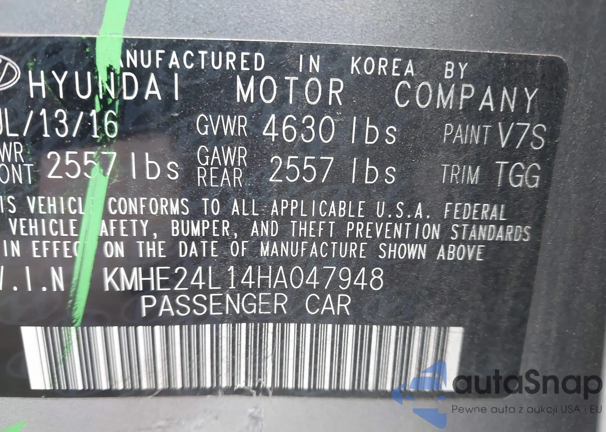 LOT: 43586527 VIN: KMHE24L14HA047948