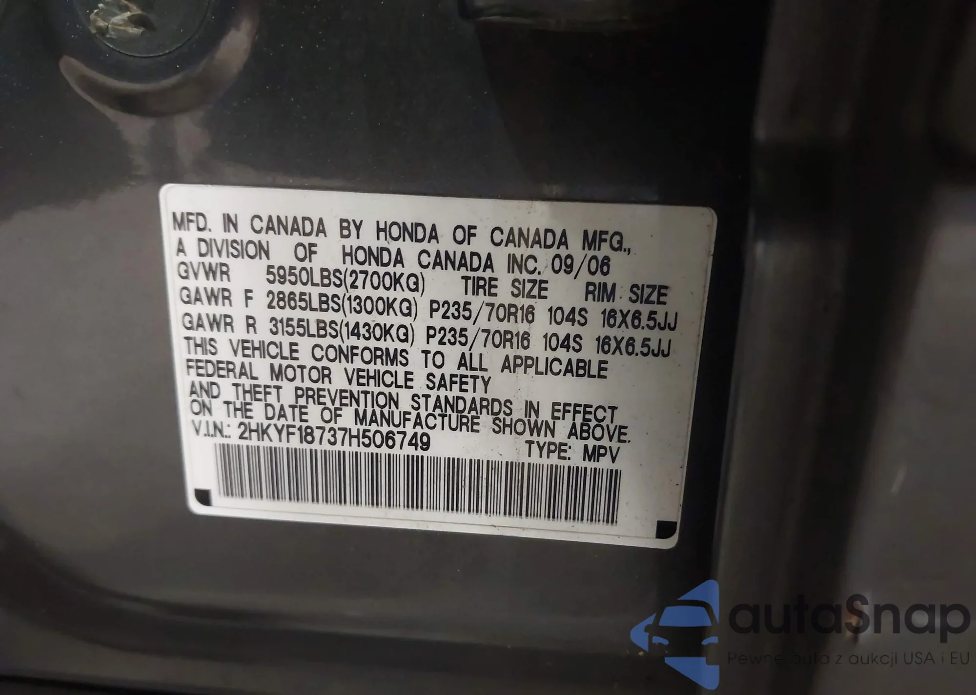 • VIN 2HKYF18737H506749