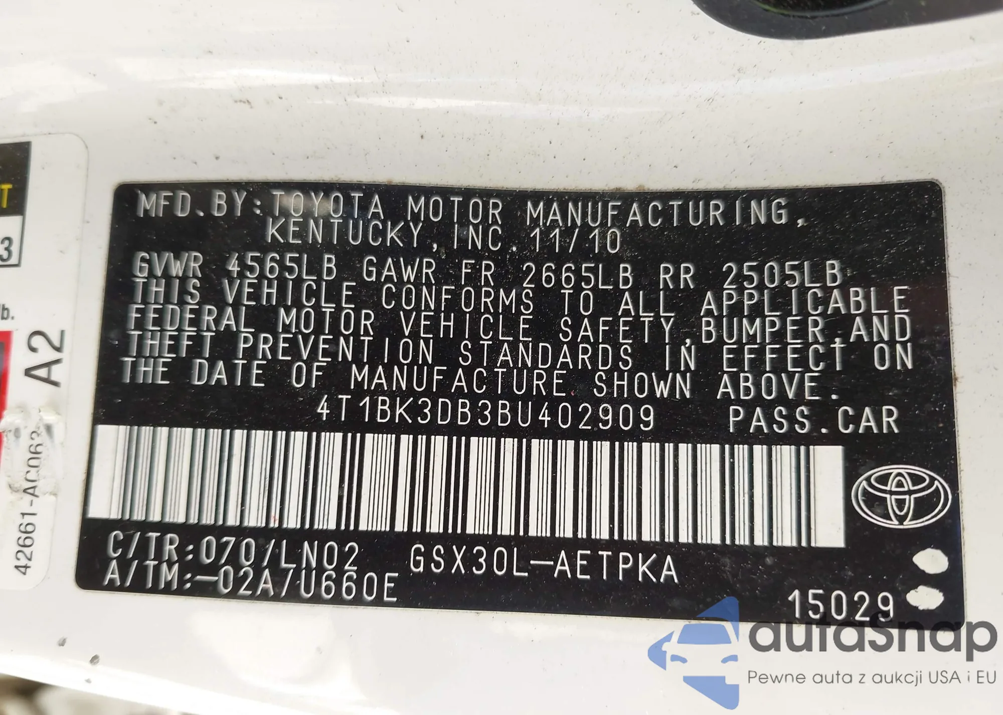 • VIN 4T1BK3DB3BU402909