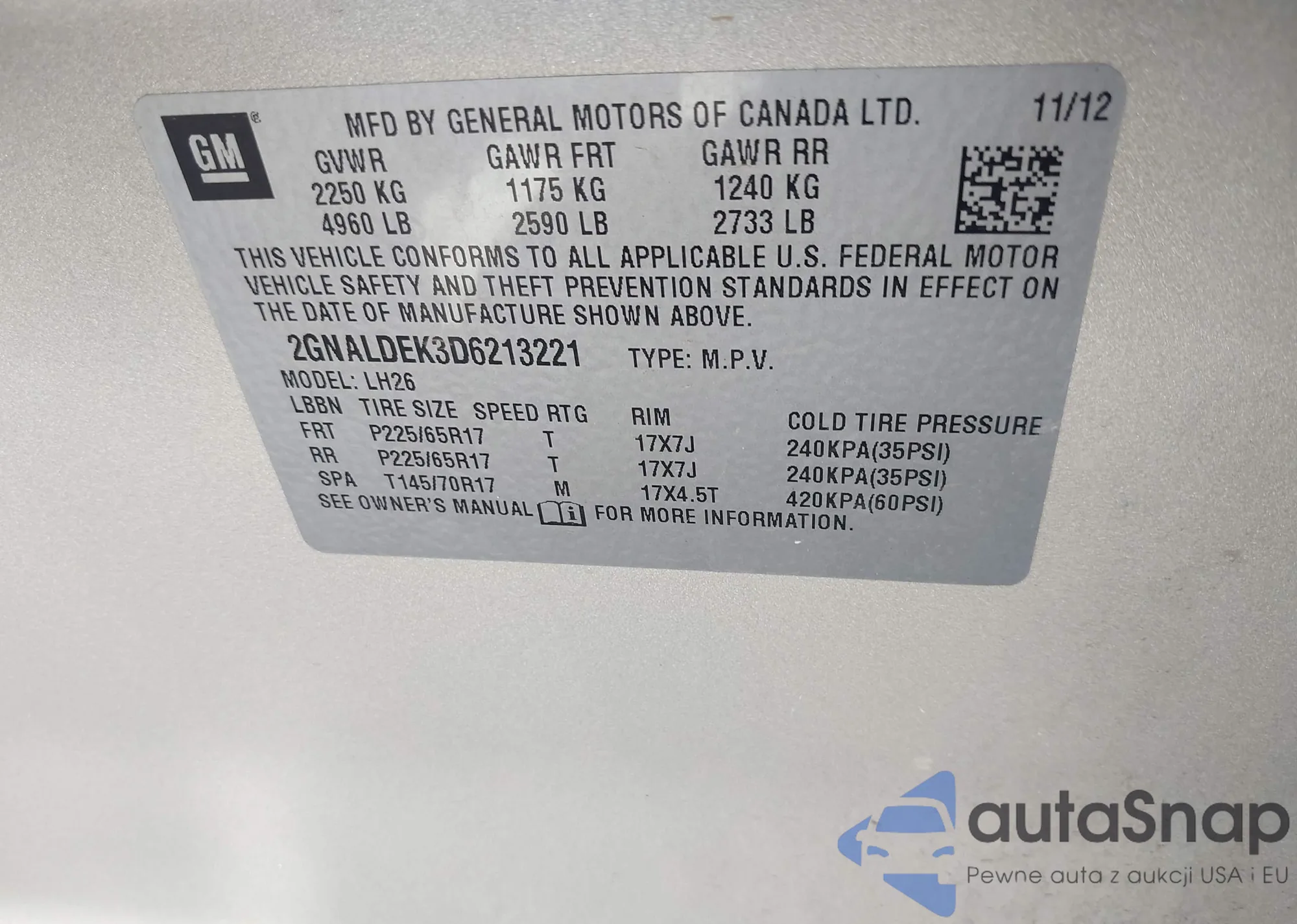 LOT: 43601055 VIN: 2HKYF18737H506749