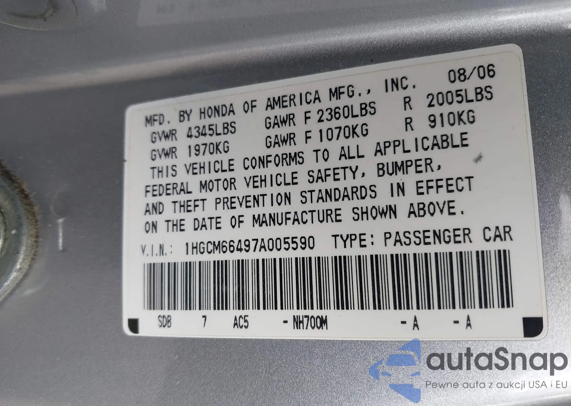 LOT: 43537840 VIN: 1HGCM66497A005590