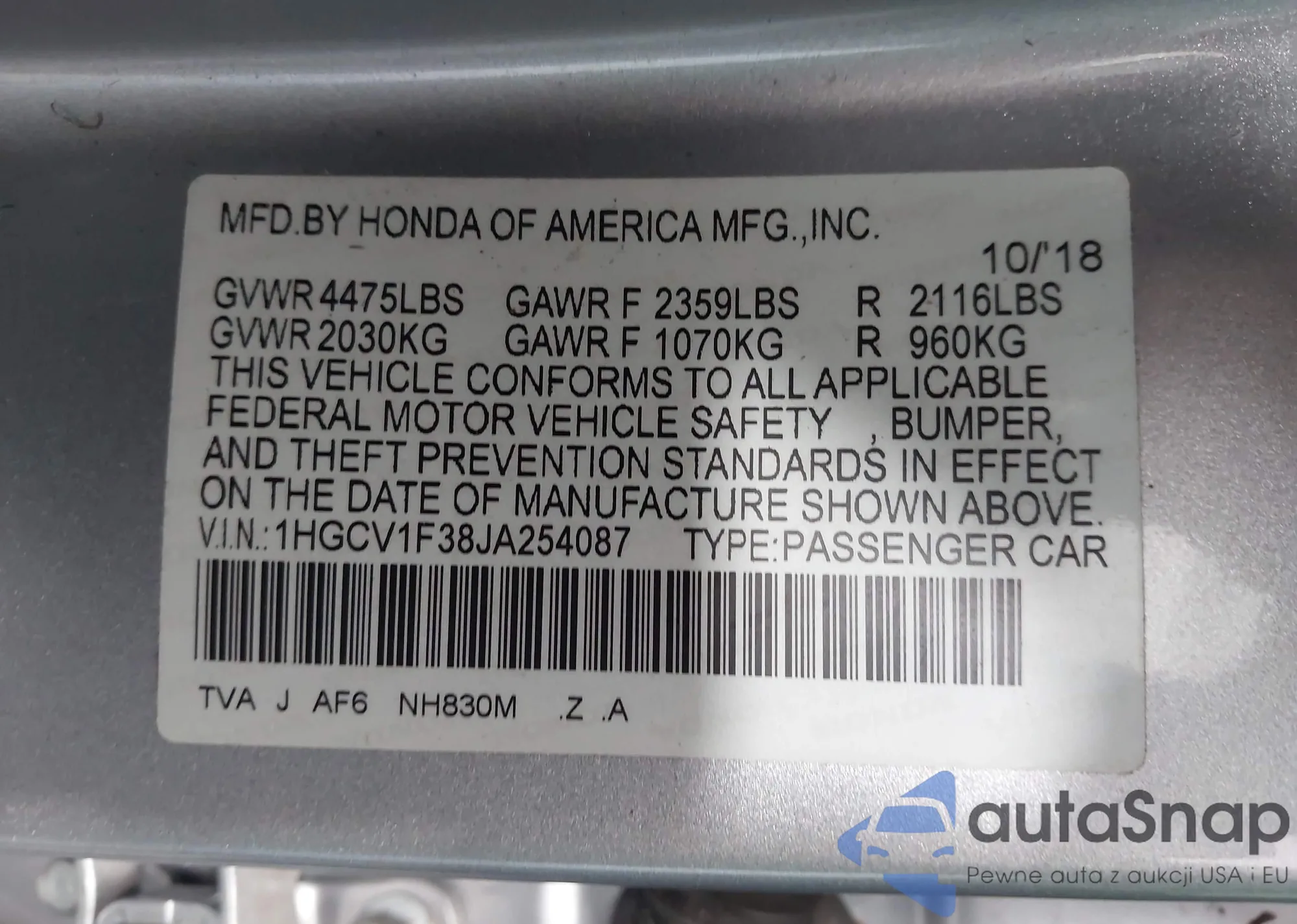 LOT: 43581942 VIN: 1HGCV1F38JA254087