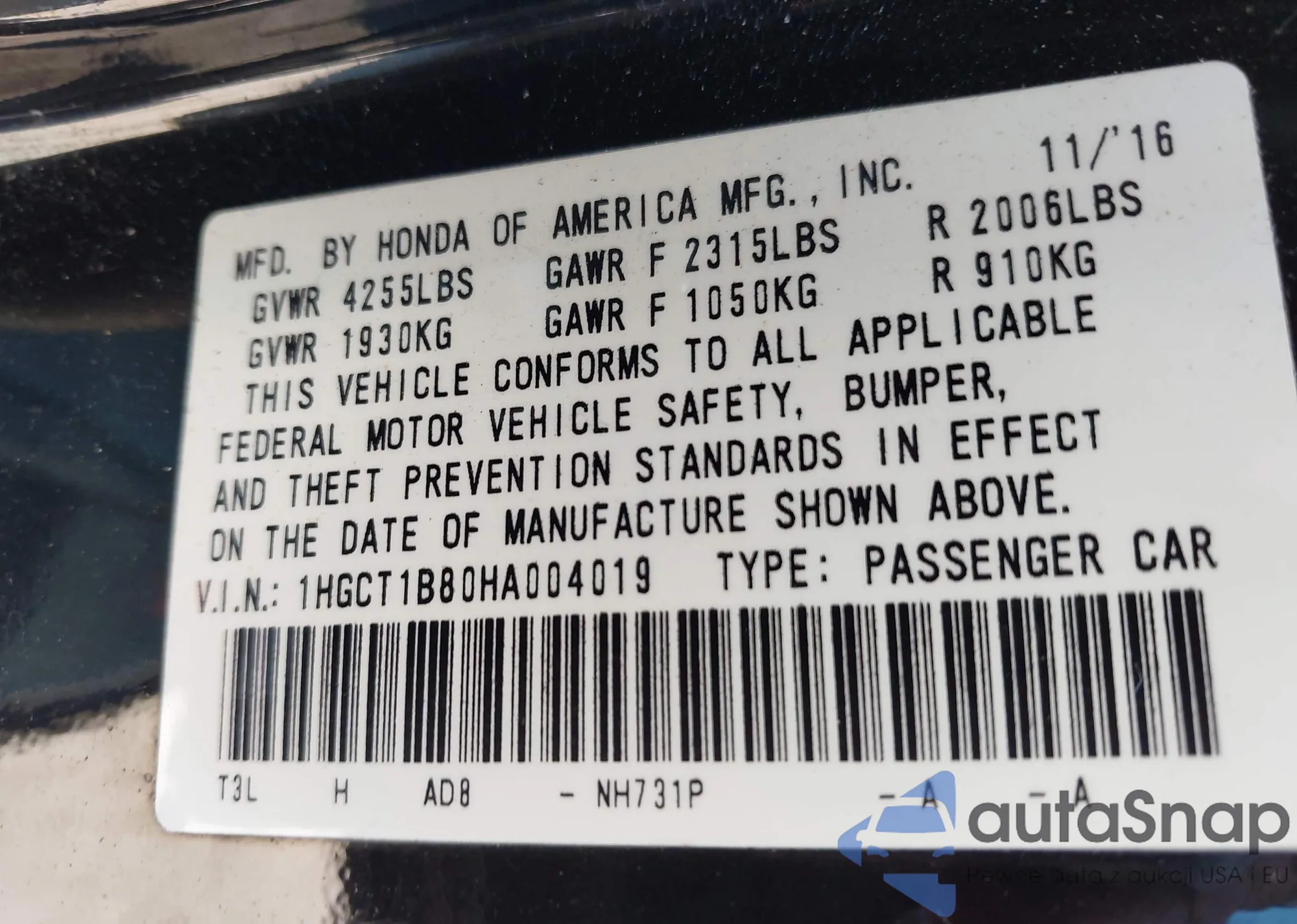 LOT: 43442201 VIN: 1HGCT1B80HA004019