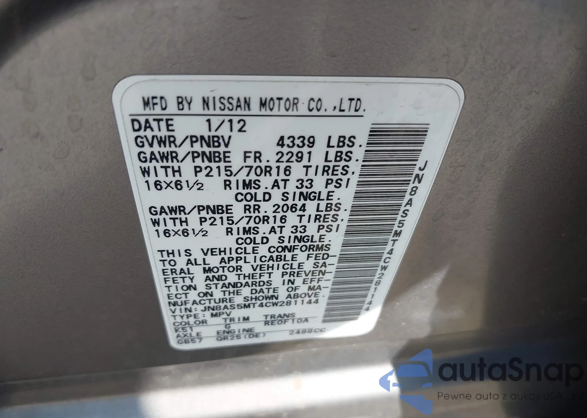 LOT: 43487388 VIN: JN8AS5MT4CW281144
