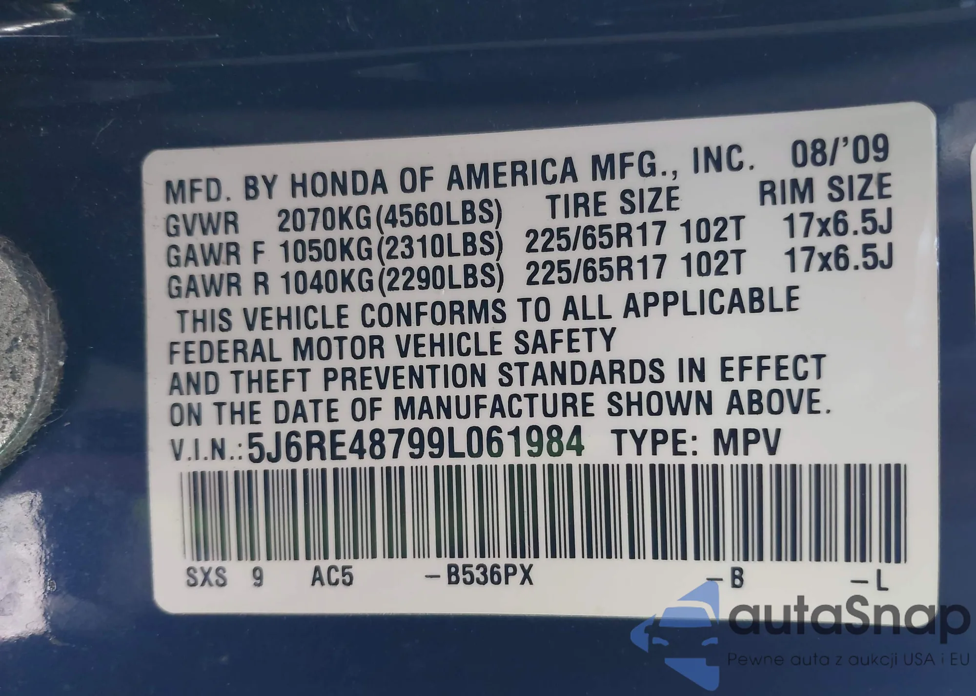 • VIN 5J6RE48799L061984
