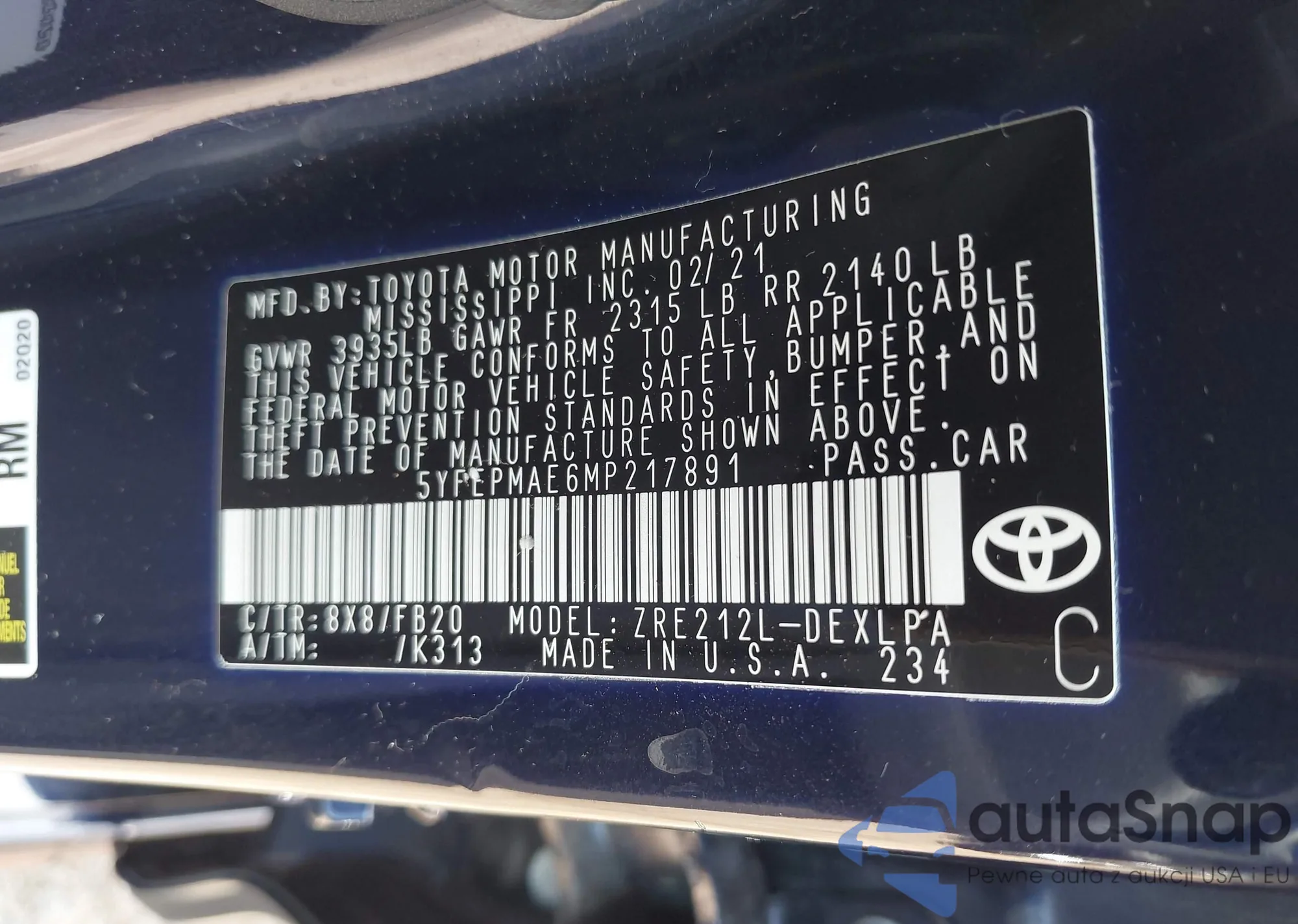 LOT: 42736807 VIN: 5YFEPMAE6MP217891