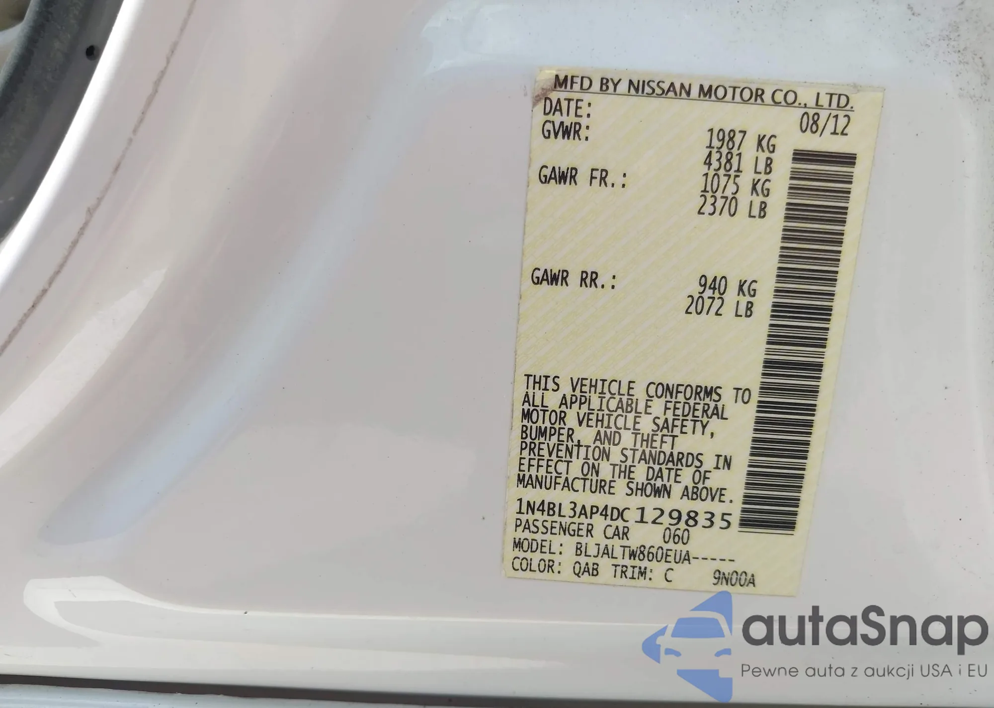 • VIN 1N4BL3AP4DC129835