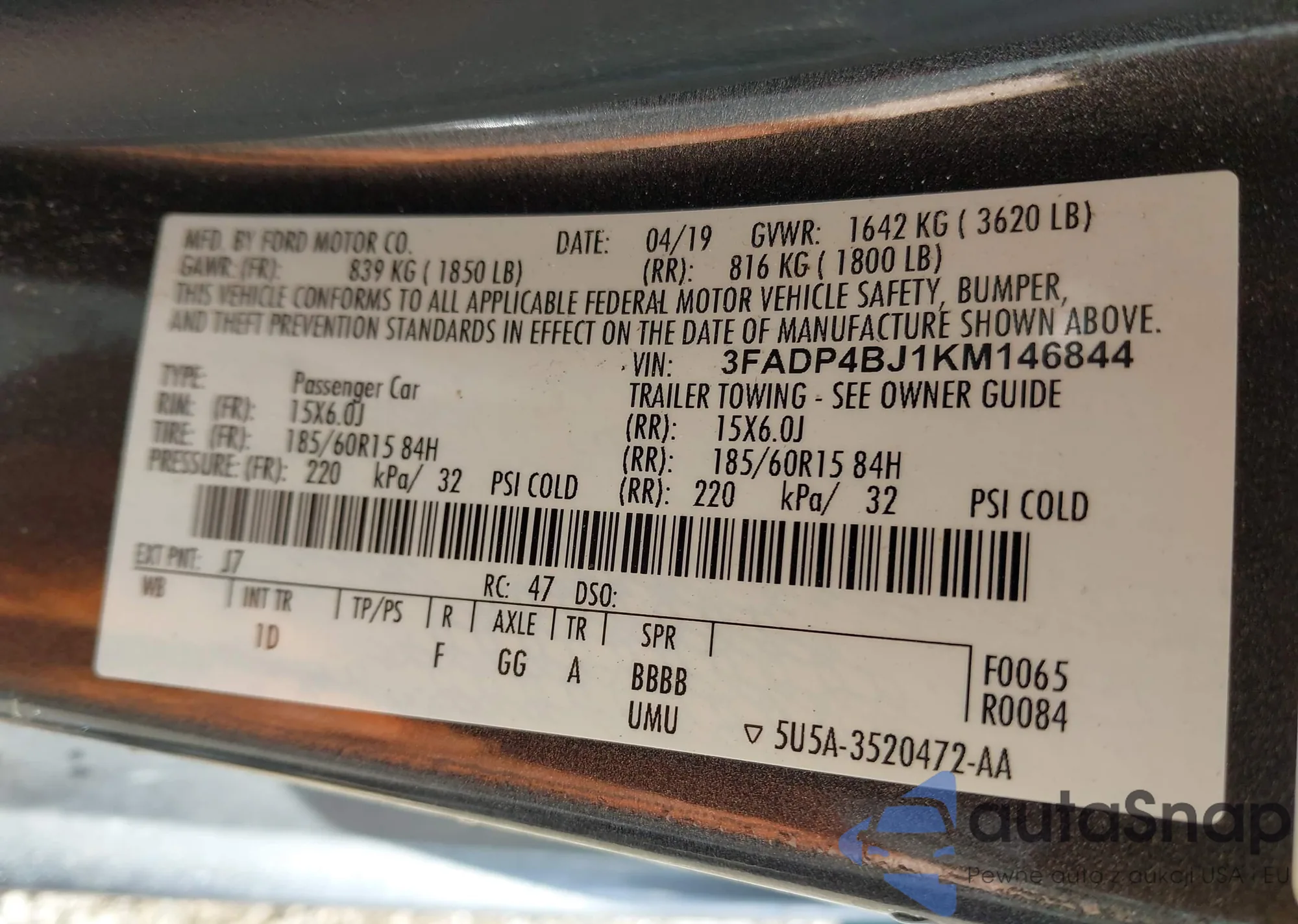 LOT: 43499208 VIN: 3FADP4BJ1KM146844