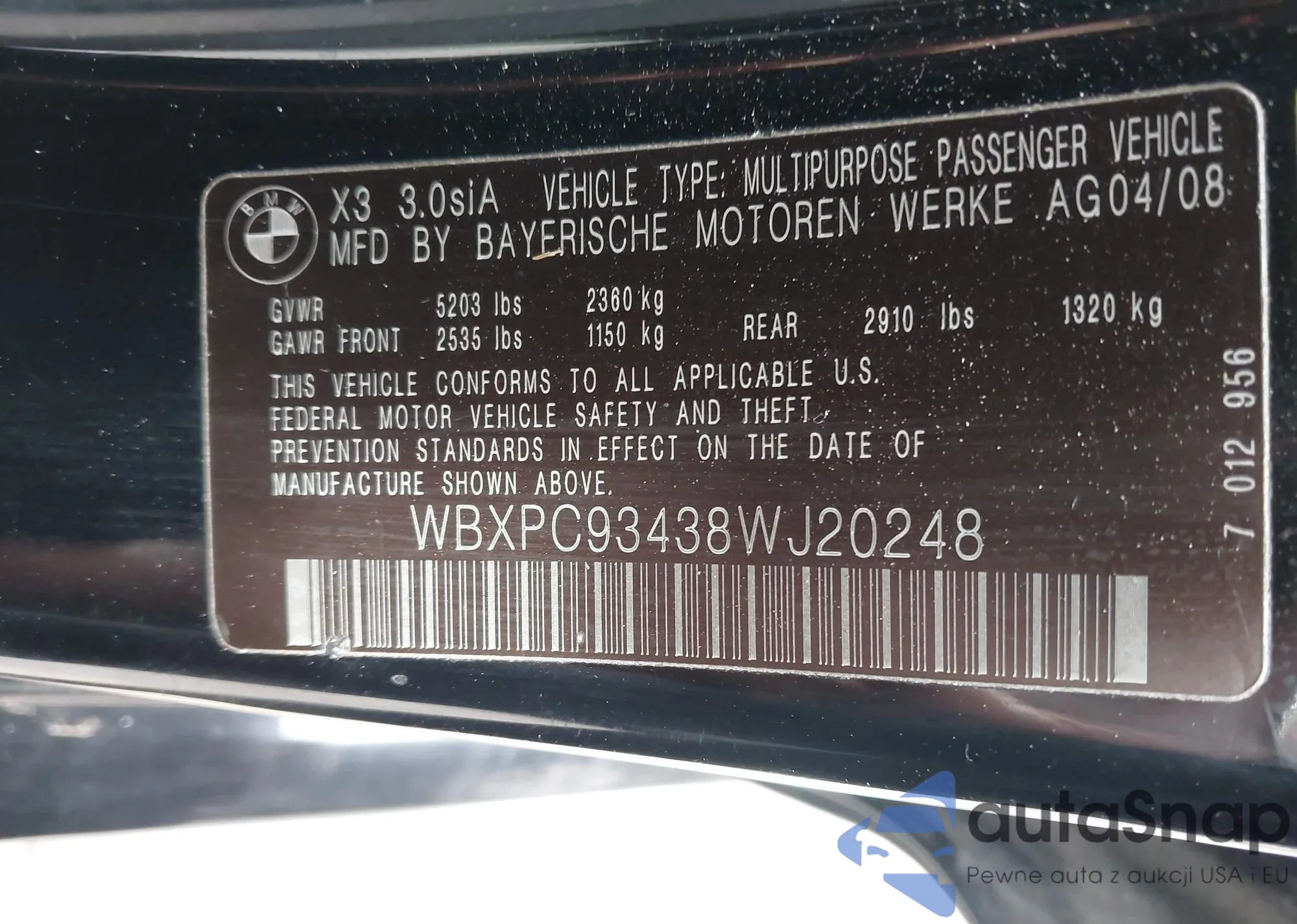 LOT: 43293595 VIN: WBXPC93438WJ20248