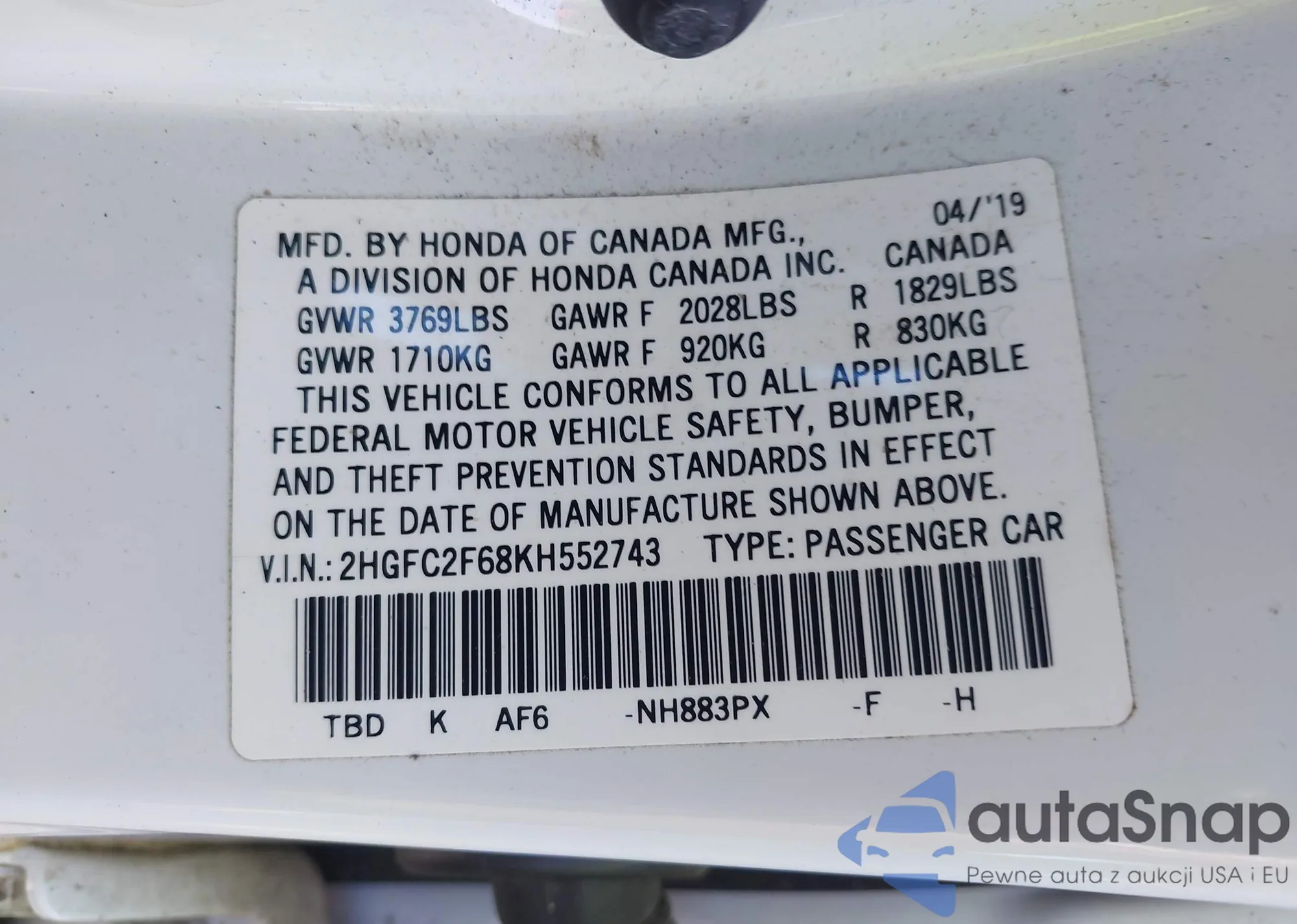 • VIN 2HGFC2F68KH552743