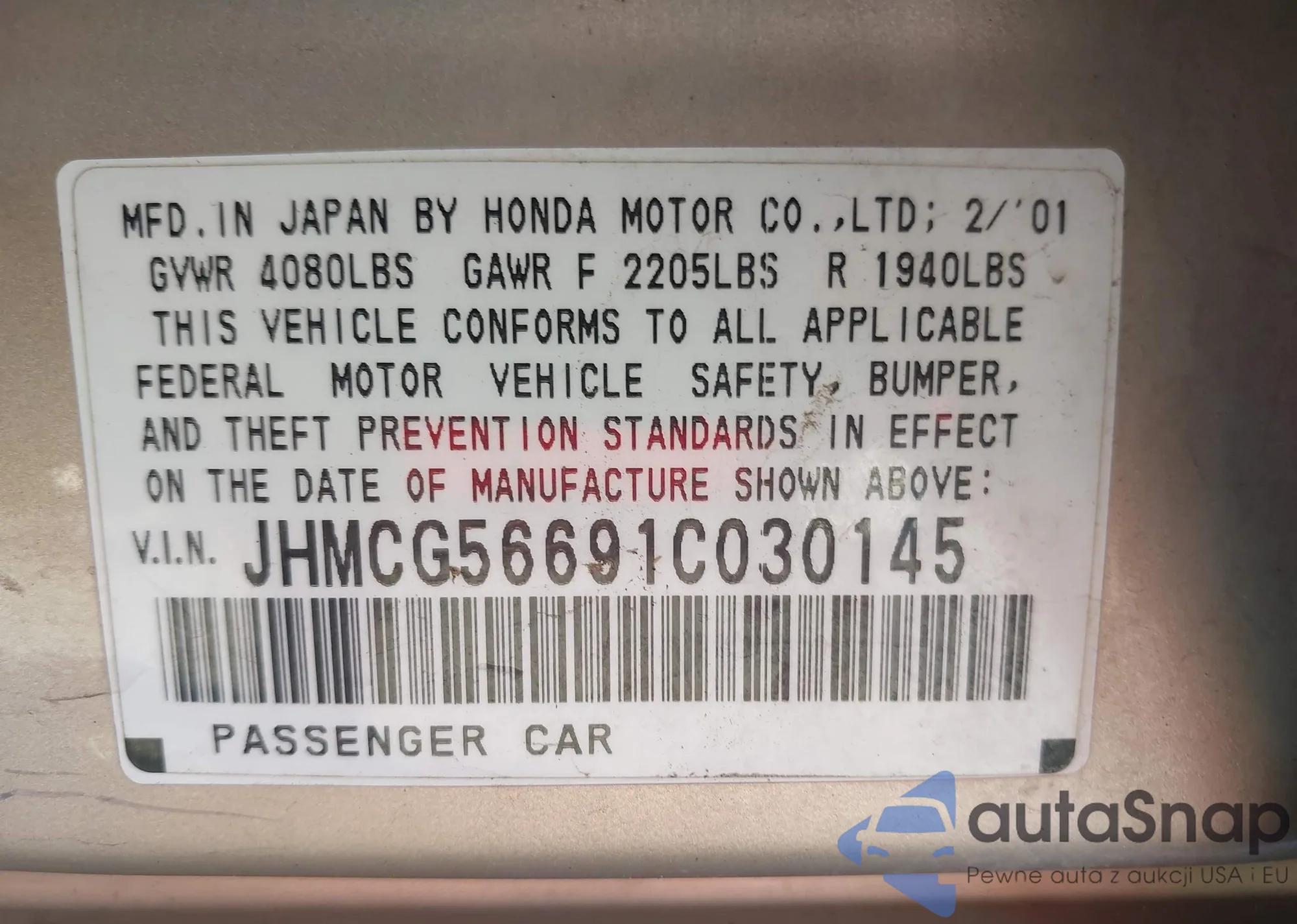 LOT: 43363409 VIN: JHMCG56691C030145