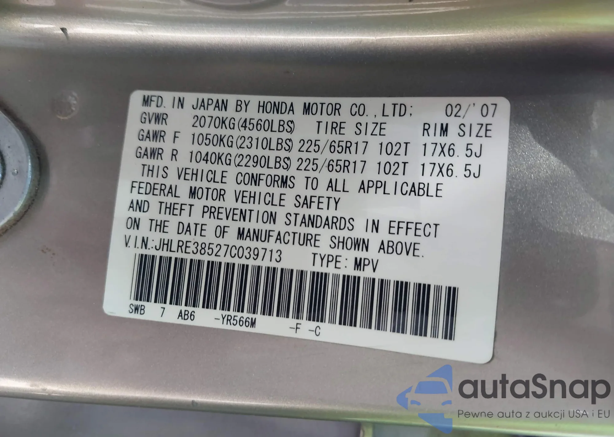 LOT: 43254044 VIN: JHLRE38527C039713