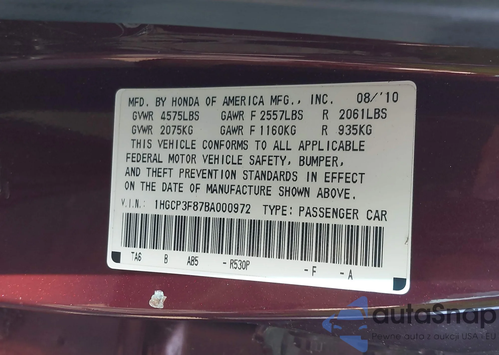 LOT: 43284712 VIN: 1HGCP3F87BA000972