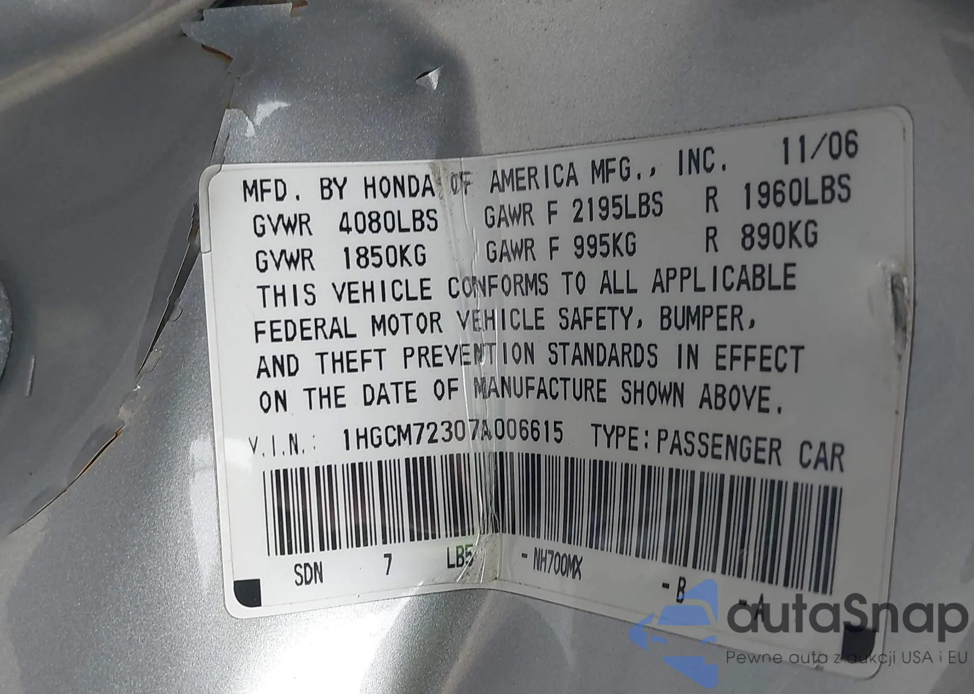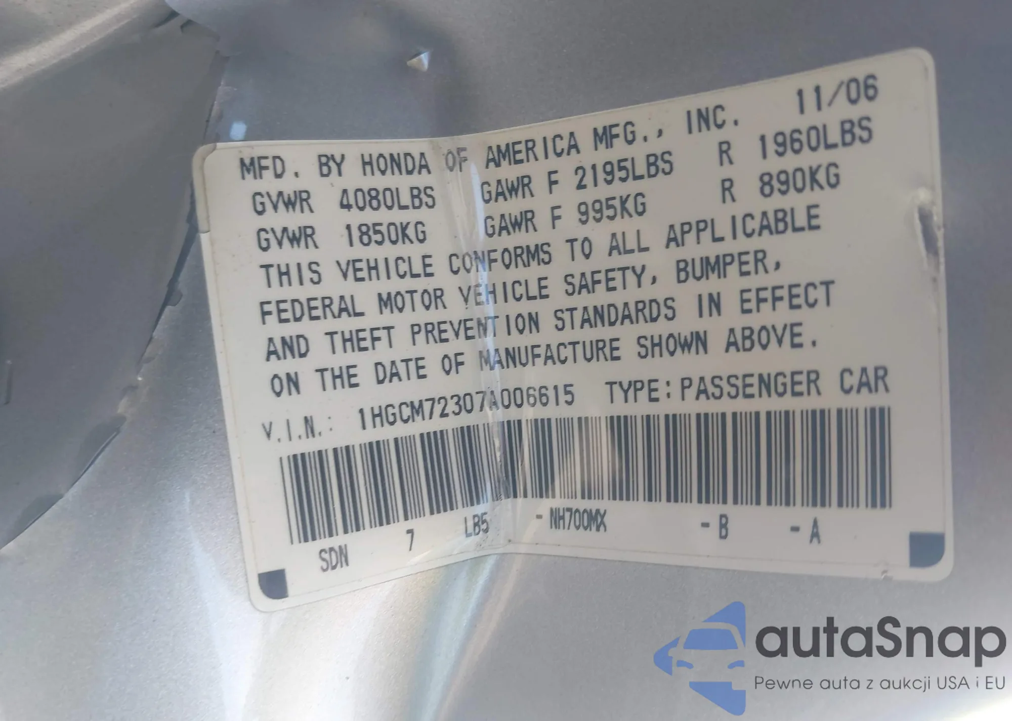 LOT: 43285714 VIN: 1HGCM72307A006615