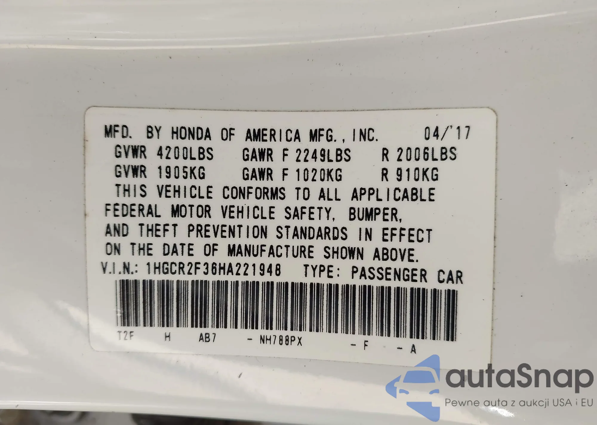 LOT: 43442236 VIN: 19UDE4H20RA029720