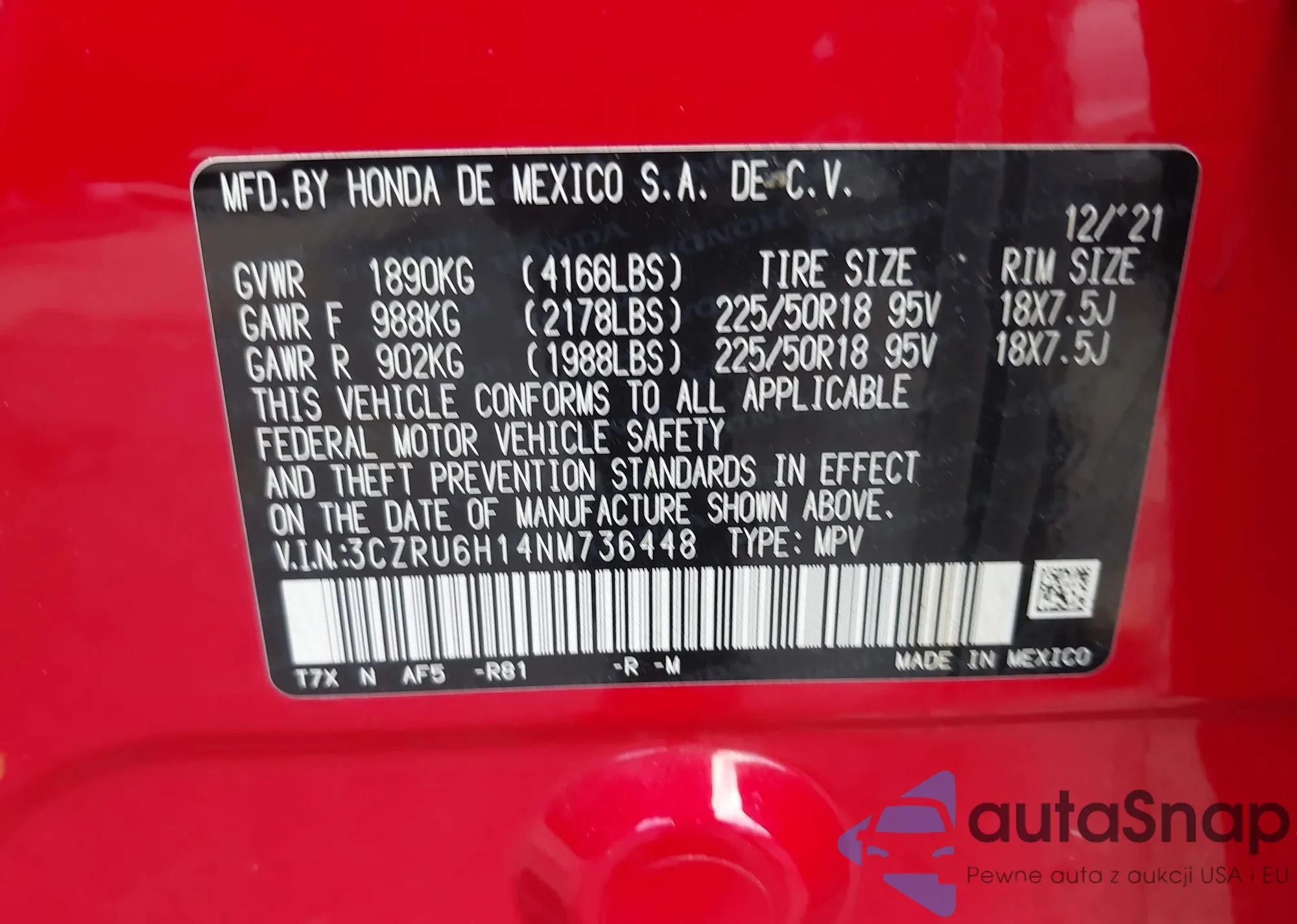 LOT: 43182247 VIN: 3CZRU6H14NM736448