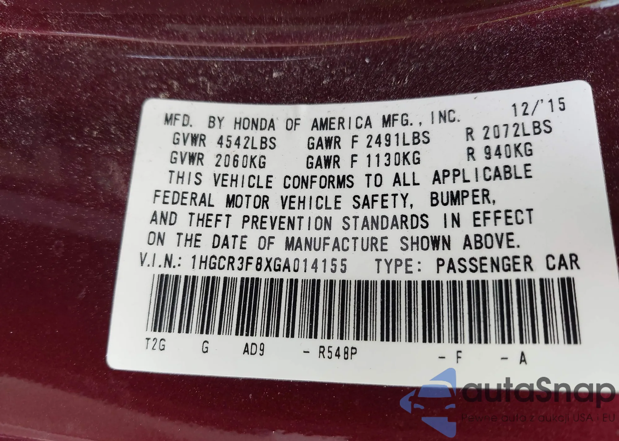 LOT: 42835943 VIN: 1HGCR3F8XGA014155