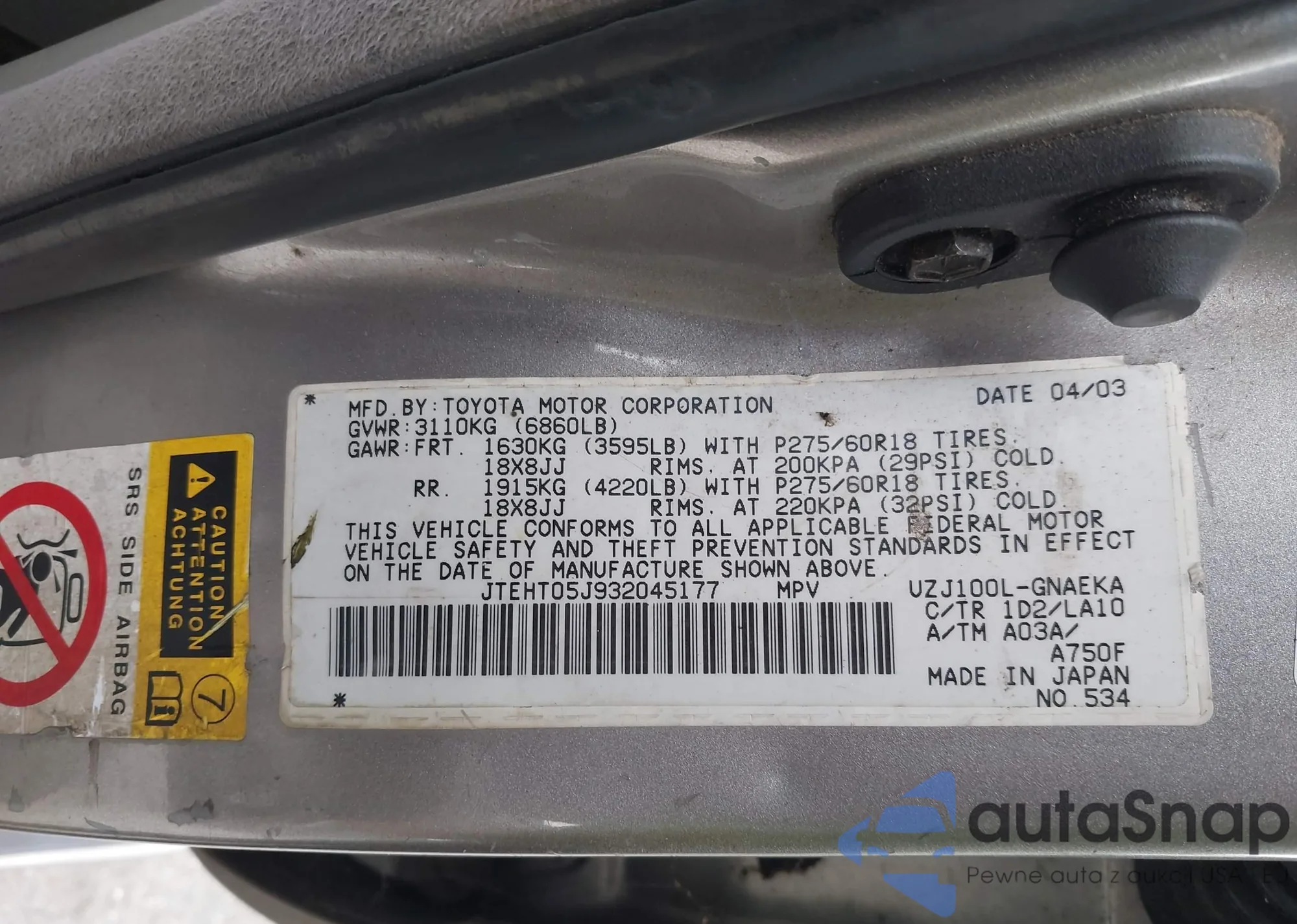 2003 Toyota Land Cruiser из США, поврежденный, VIN JTEHT05J932045177