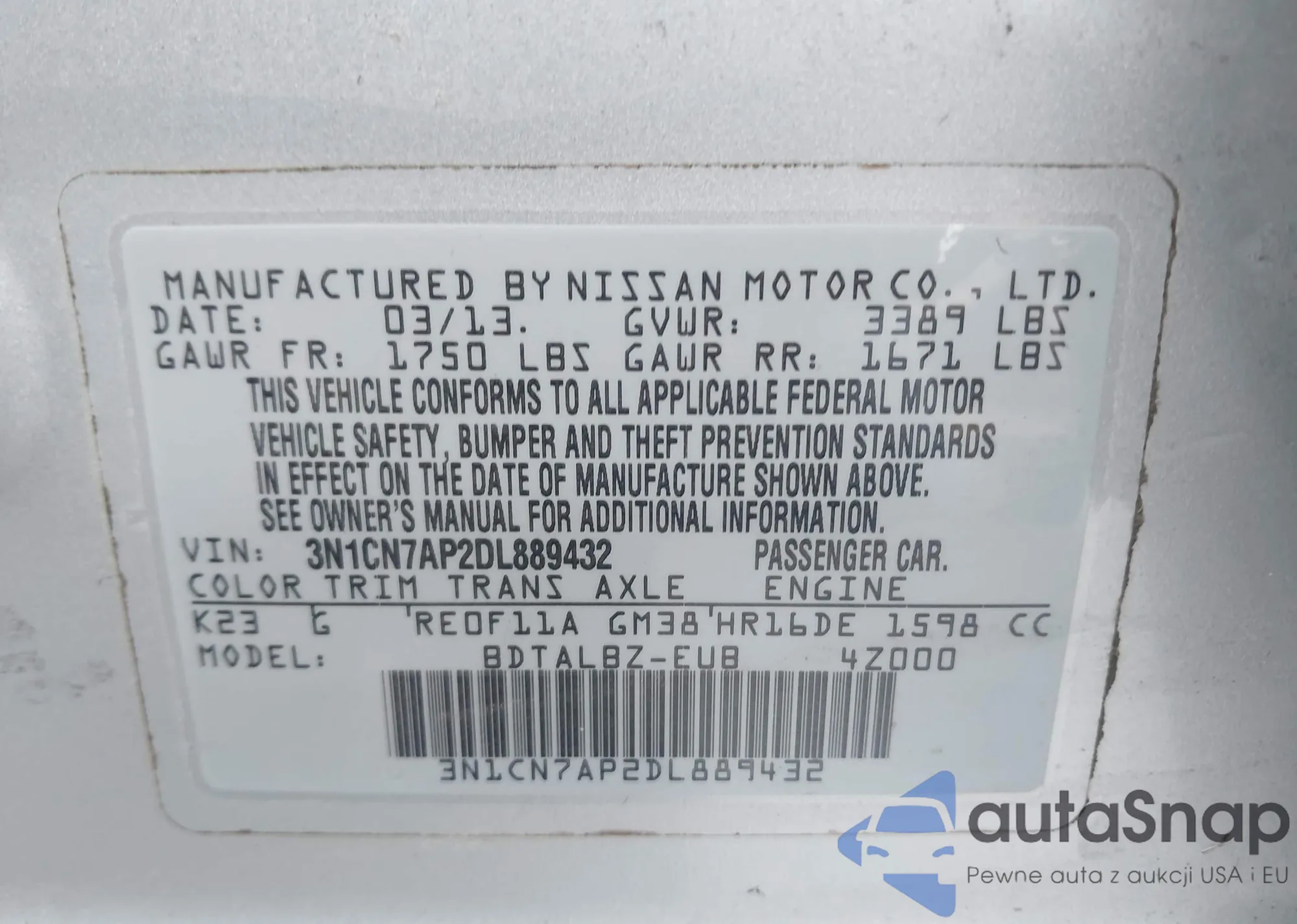 • VIN 3N1CN7AP2DL889432