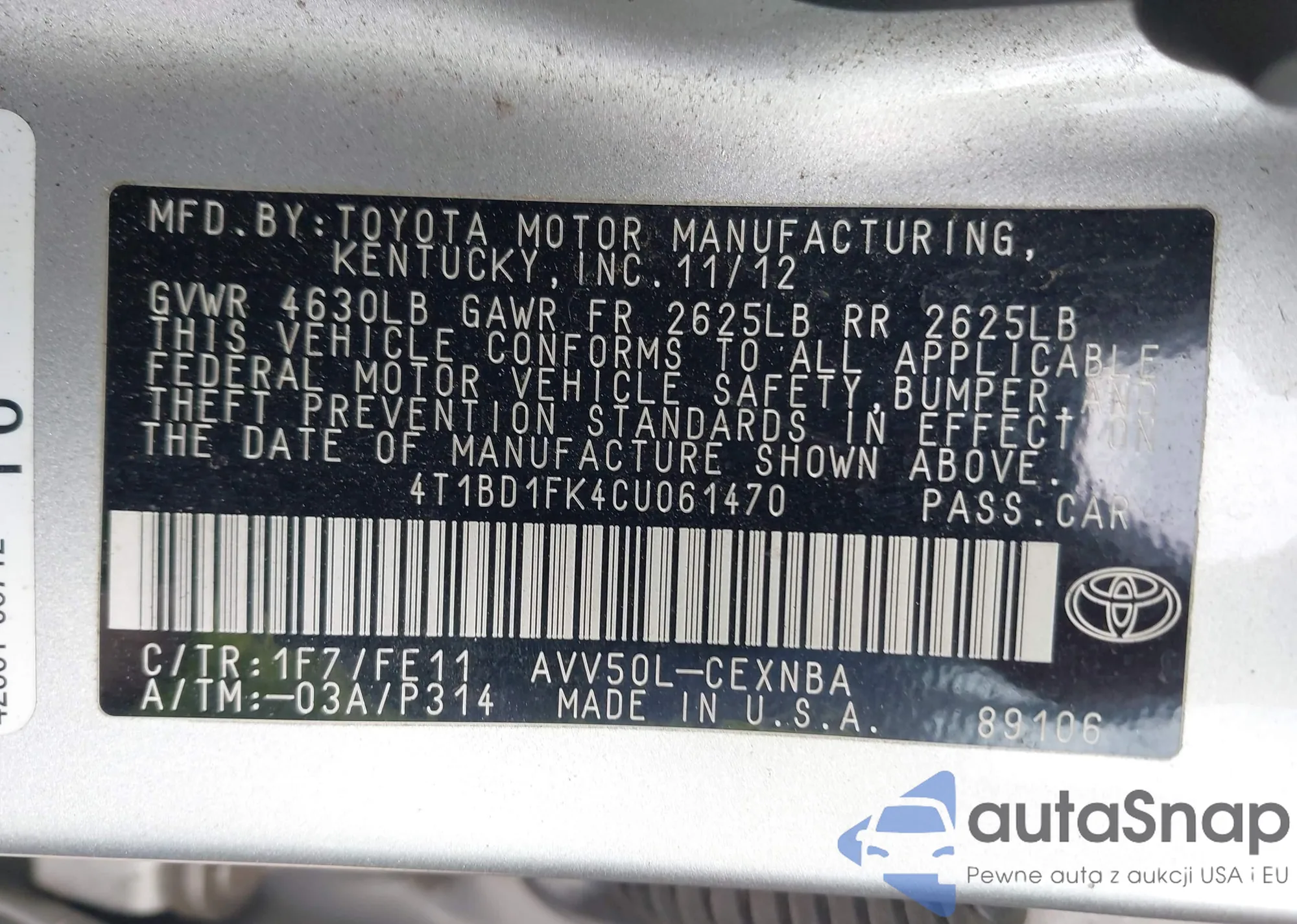 • VIN 4T1BD1FK4CU061470