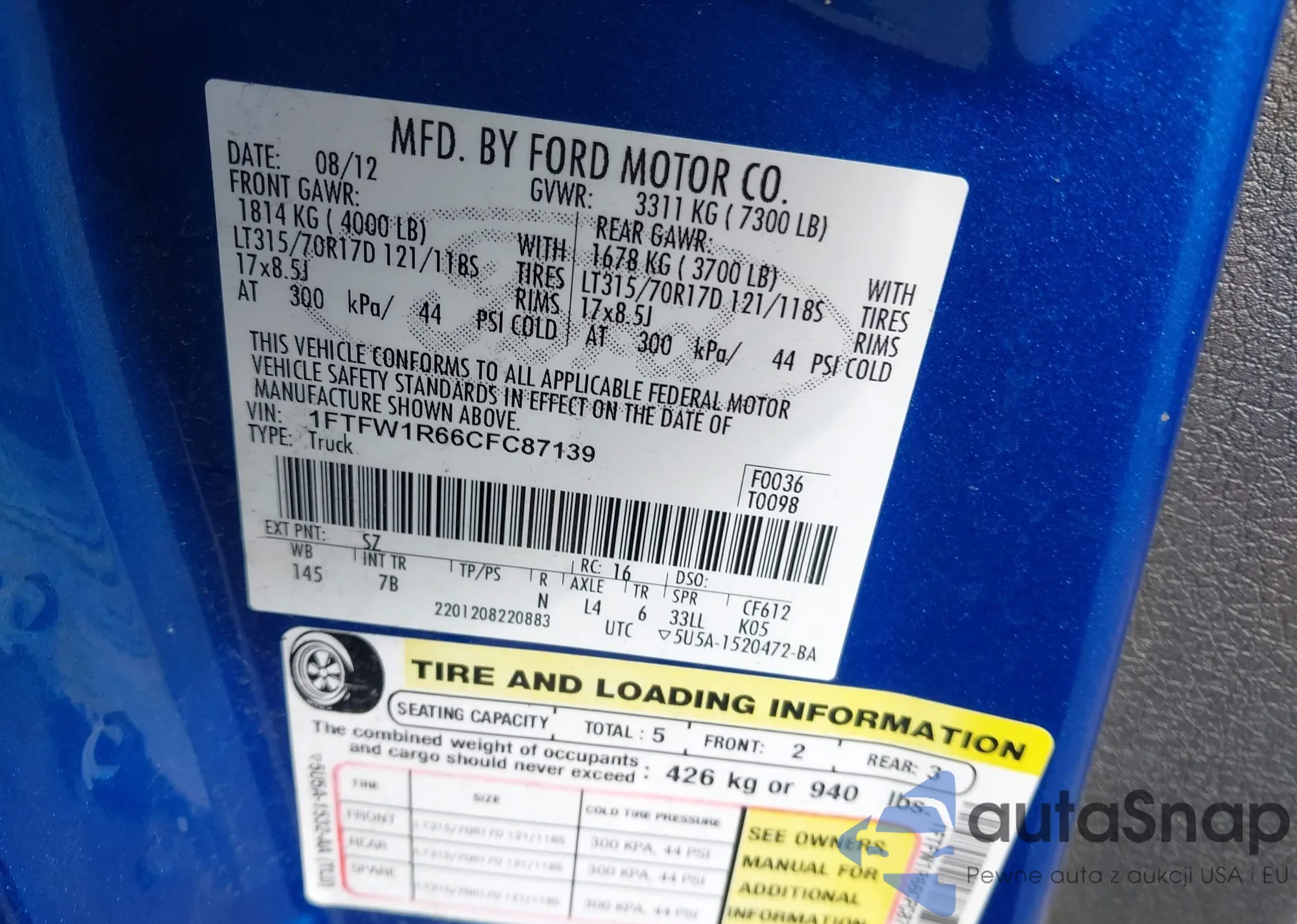 LOT: 43340153 VIN: 1FTFW1R66CFC87139