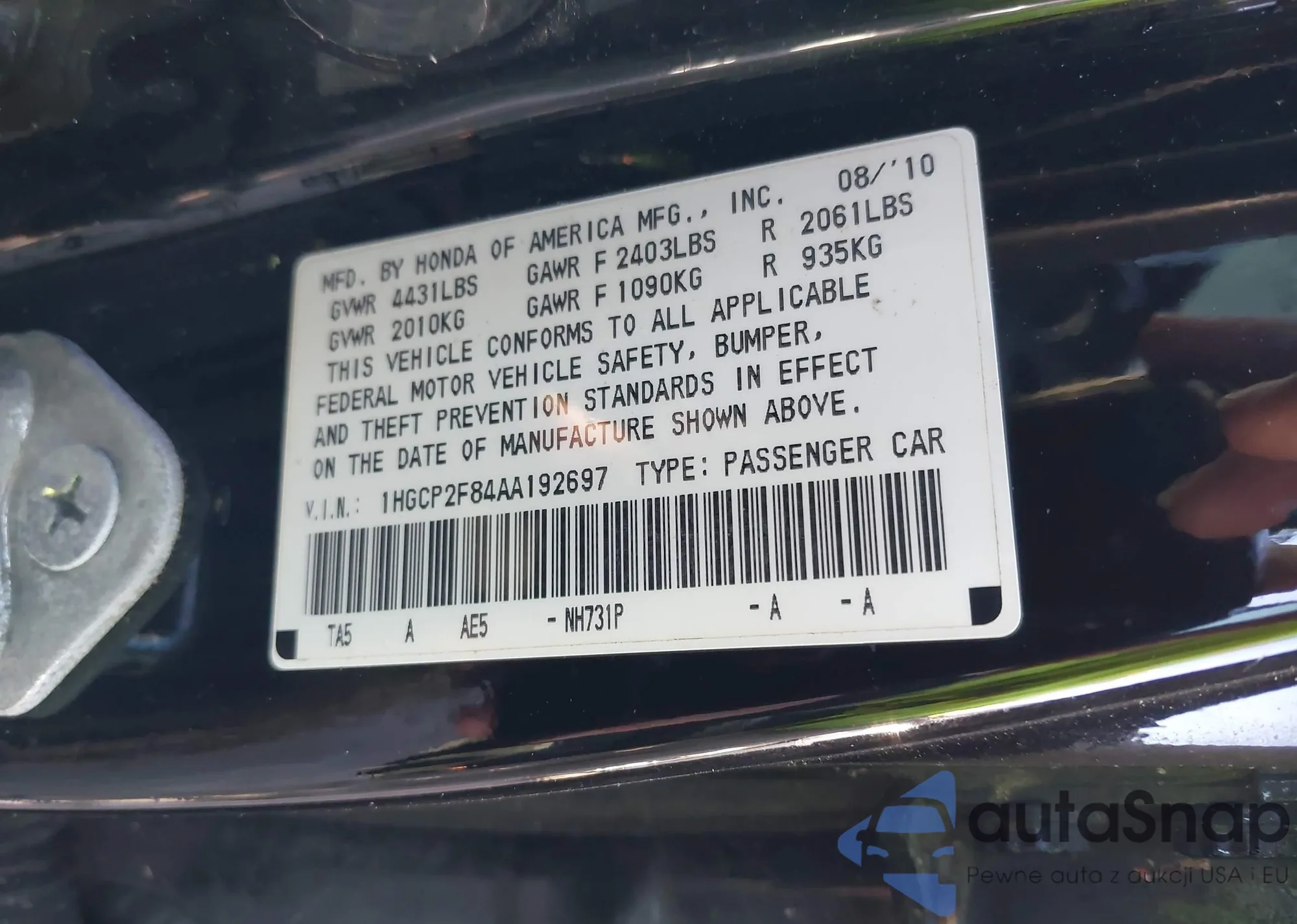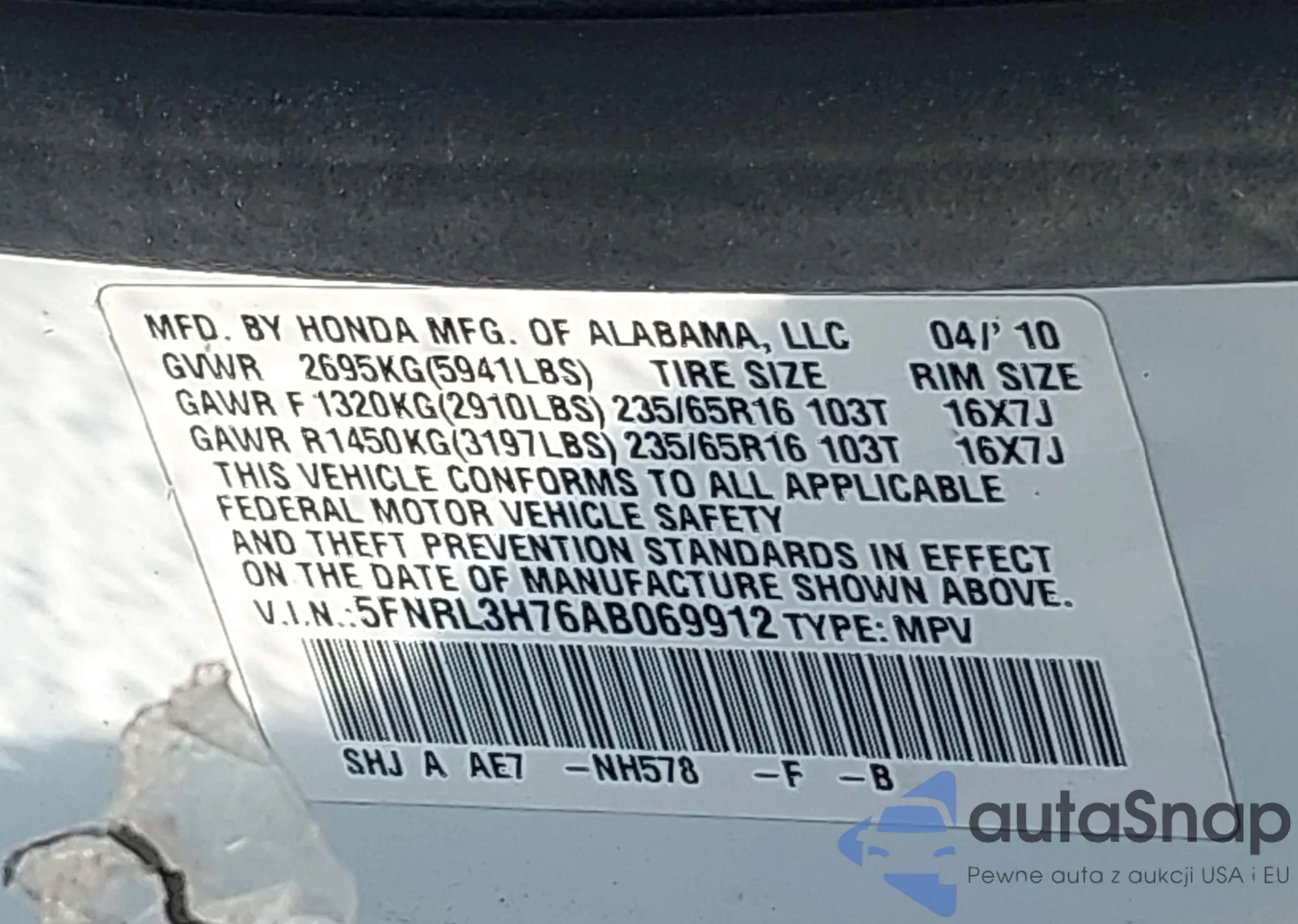 • VIN 5FNRL3H76AB069912