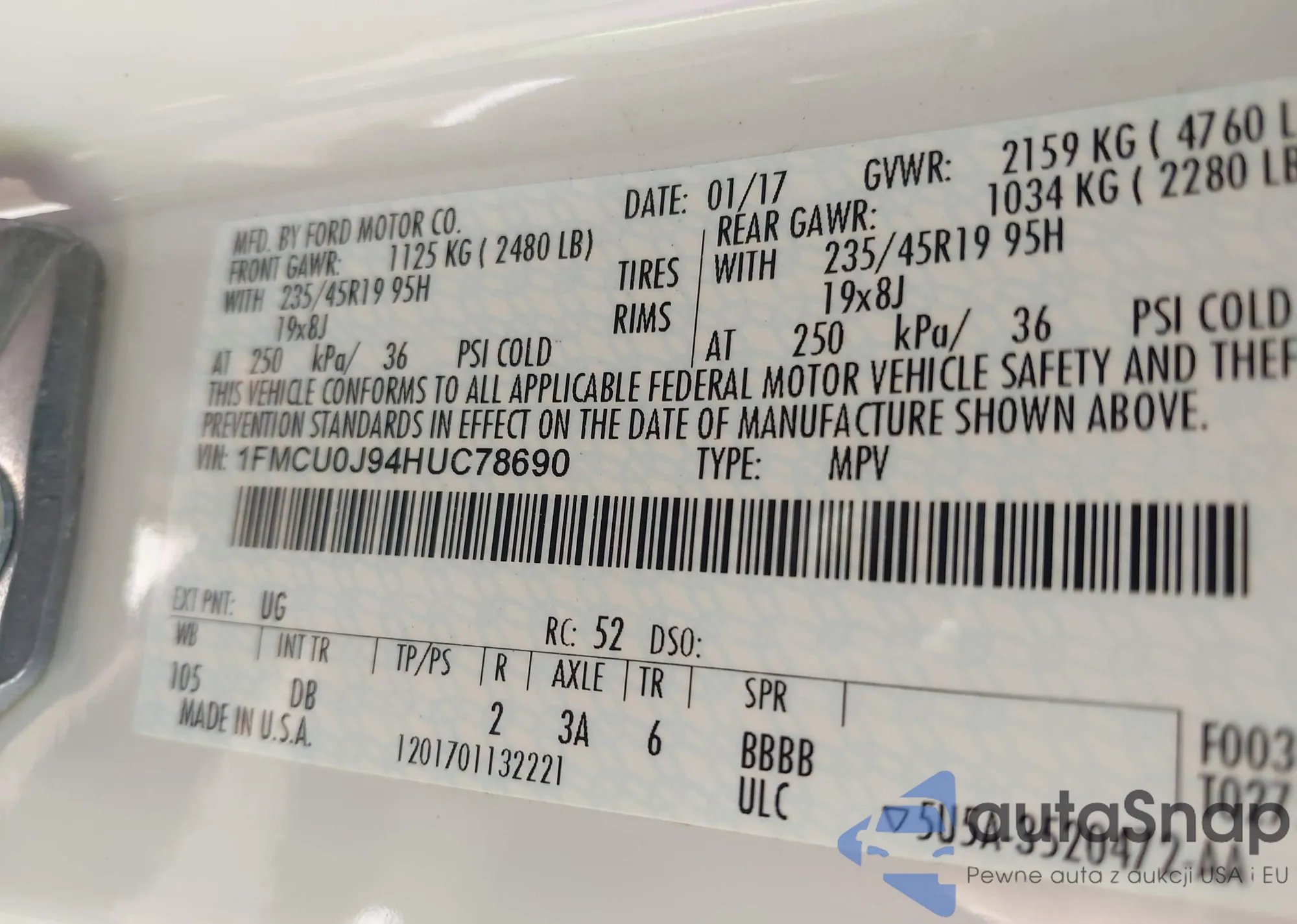 LOT: 43542467 VIN: 1FMCU0J94HUC78690