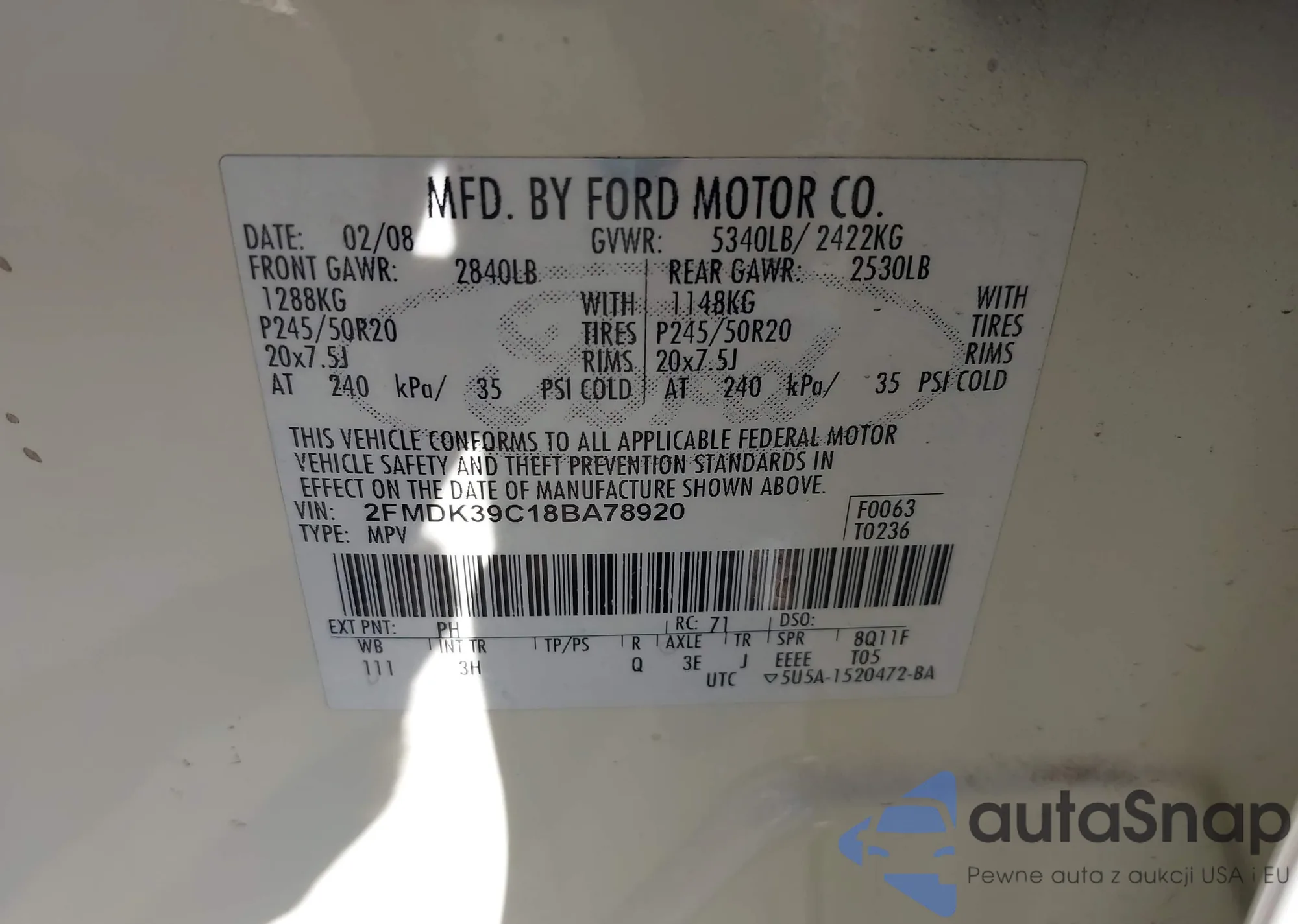 LOT: 43571480 VIN: 2FMDK39C18BA78920