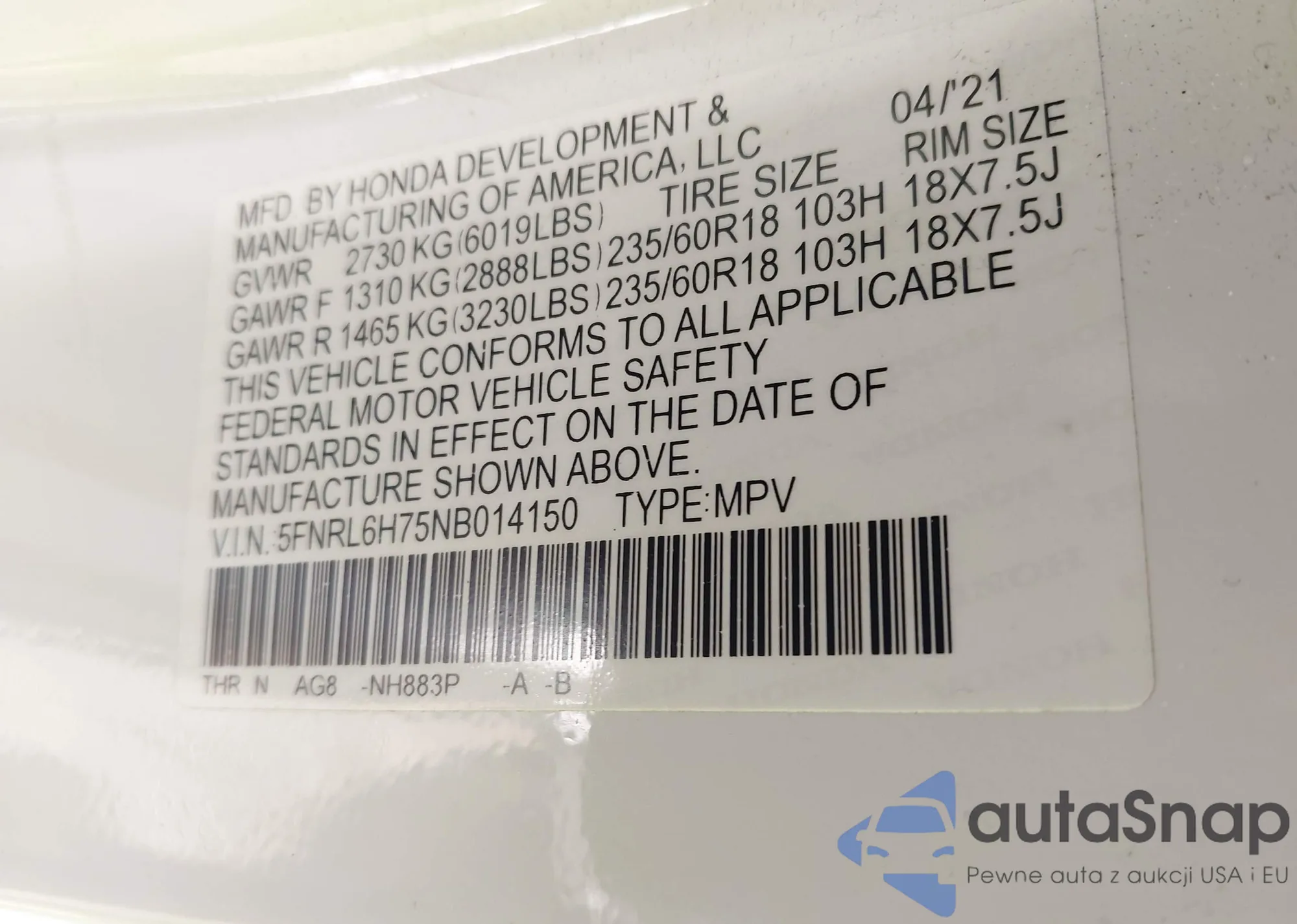 • VIN 5FNRL6H75NB014150
