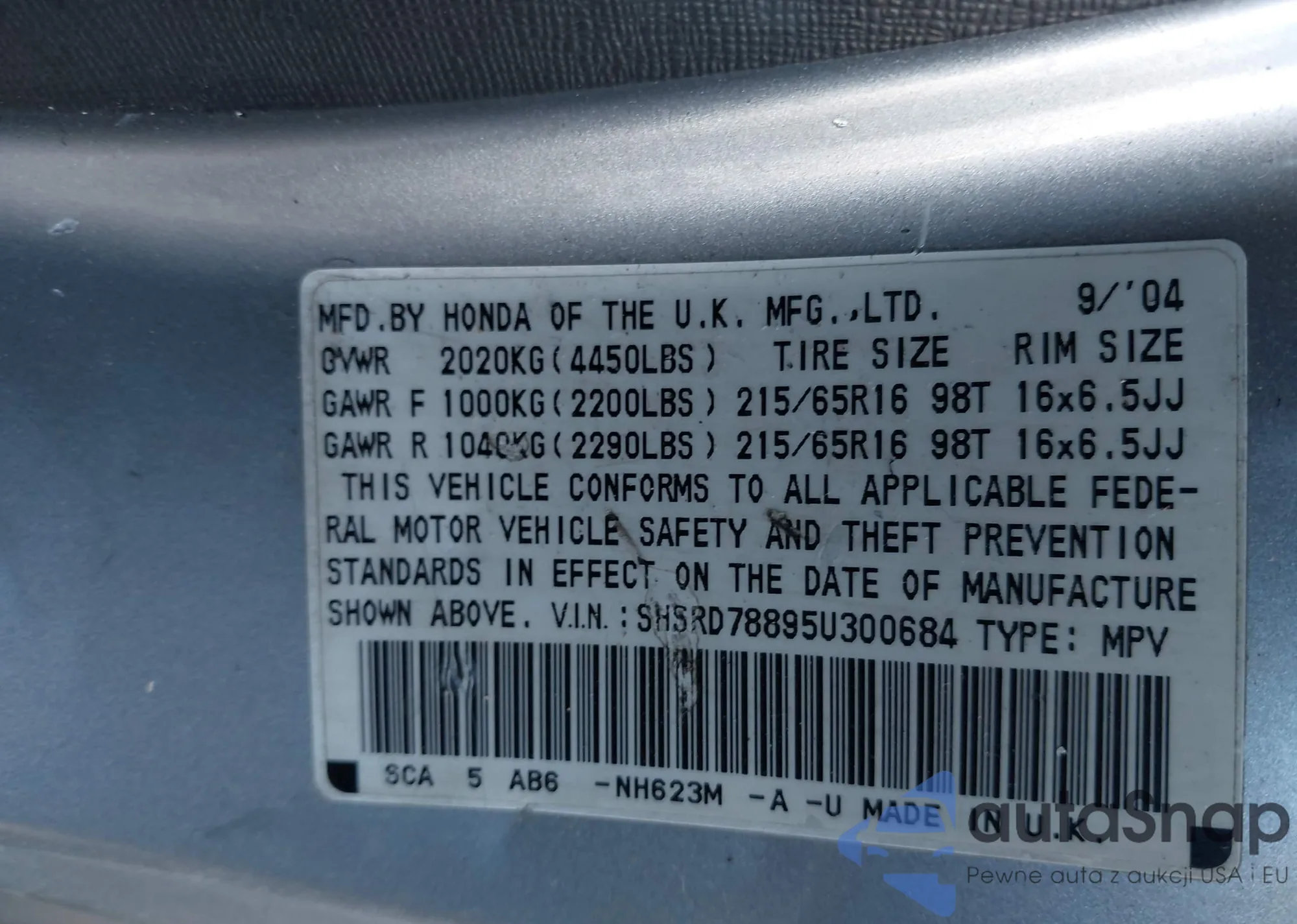 LOT: 43448322 VIN: SHSRD78895U300684