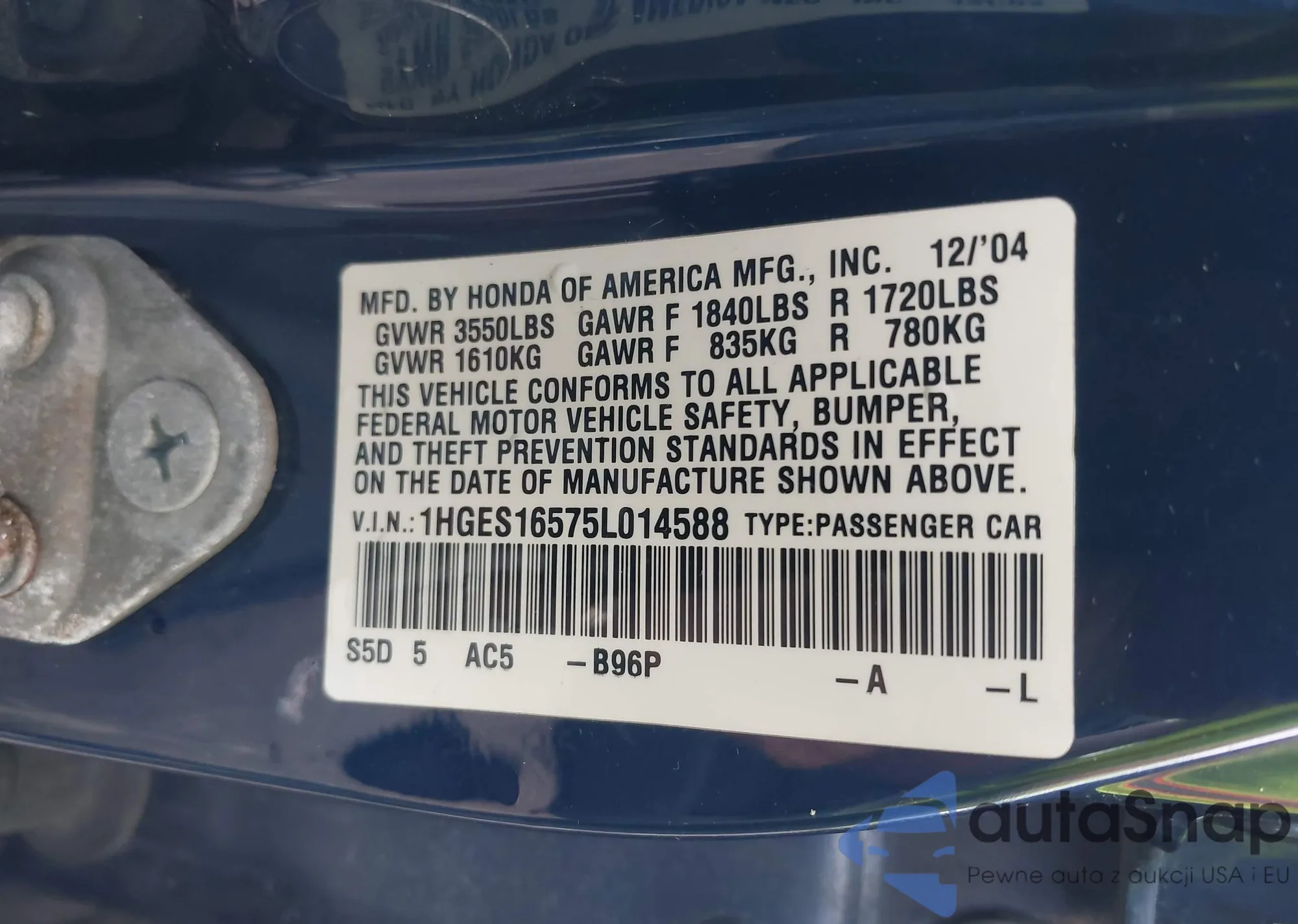 LOT: 43229718 VIN: 1HGES16575L014588
