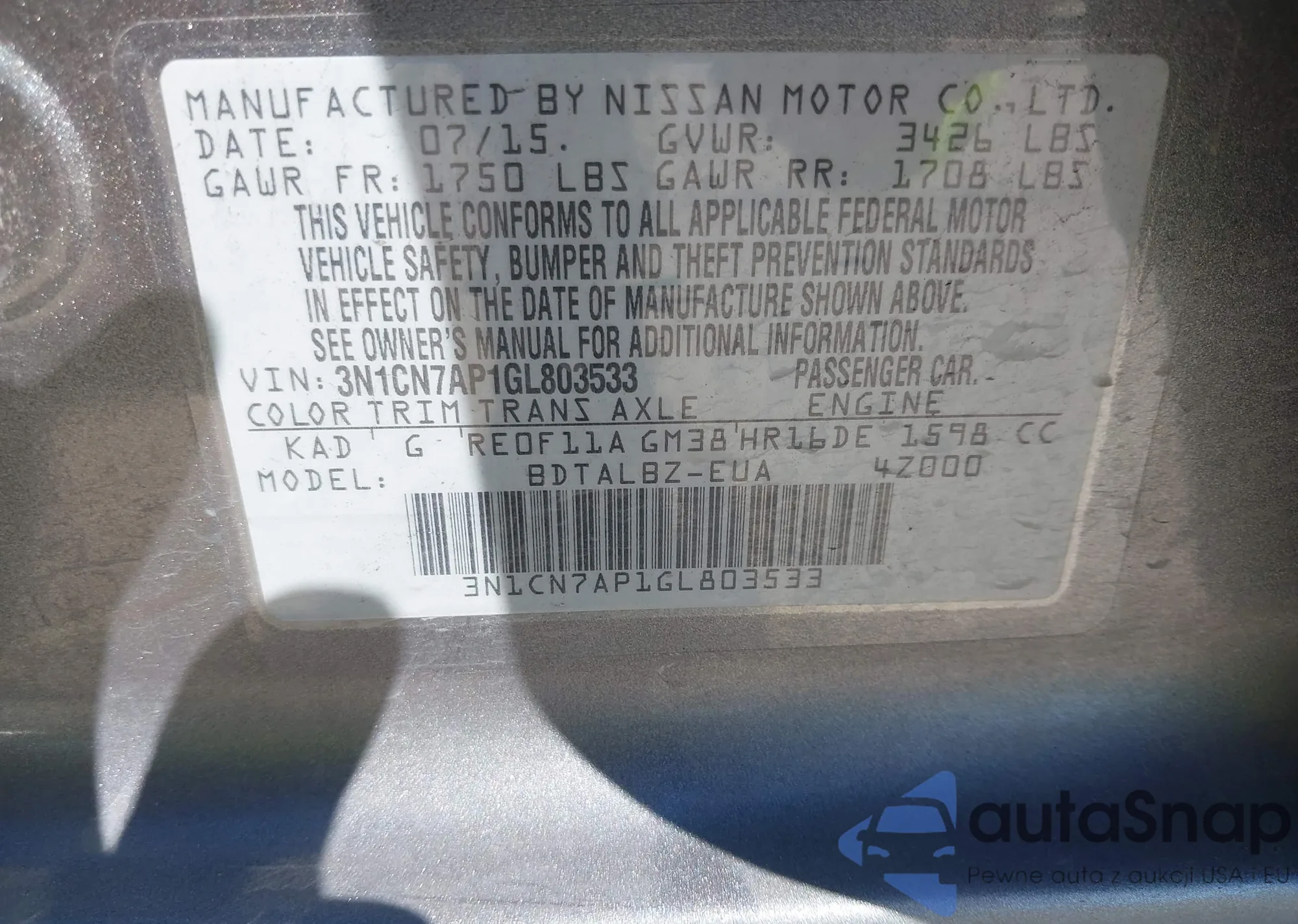 • VIN 3N1CN7AP1GL803533
