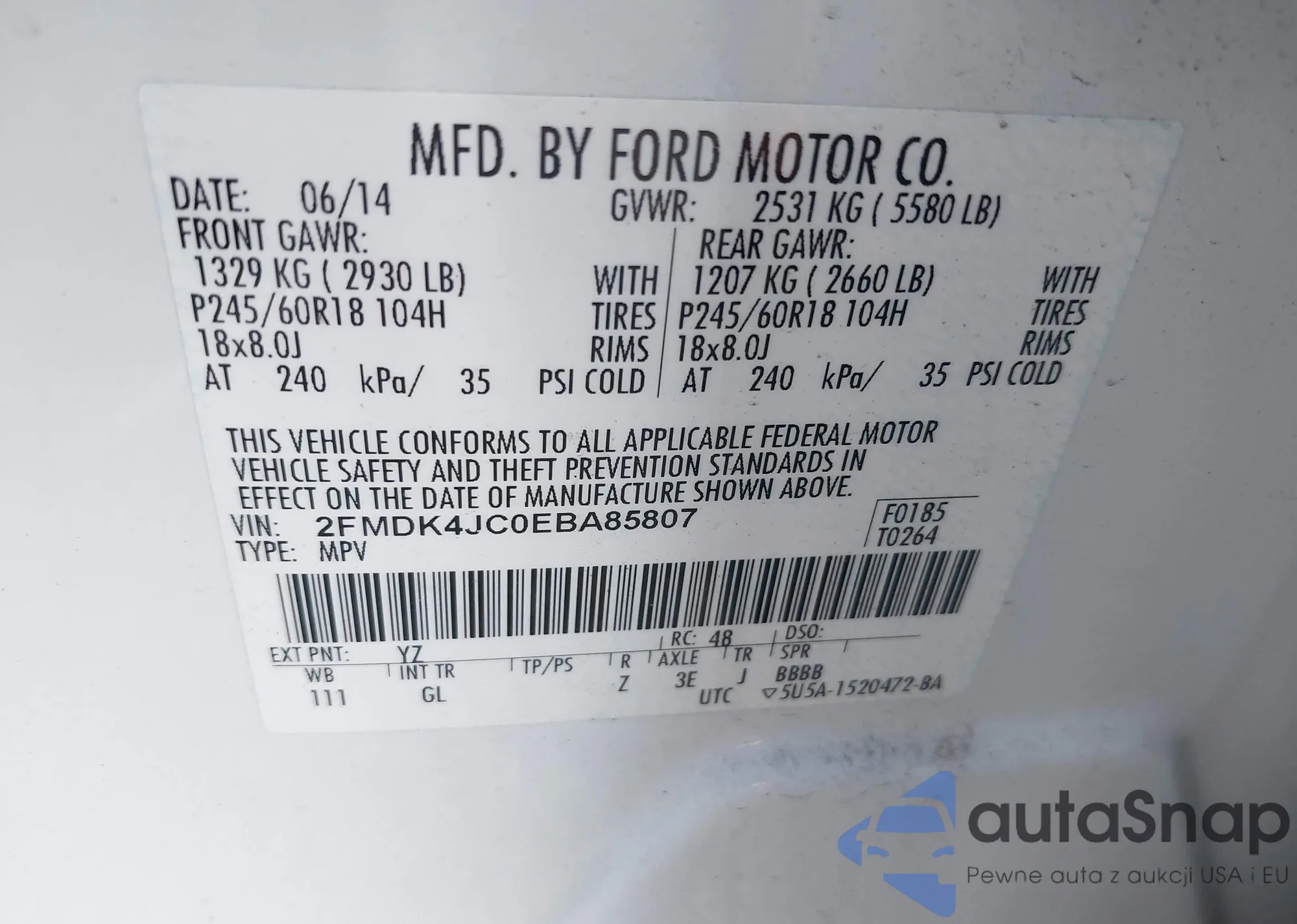 LOT: 43449286 VIN: 2FMDK4JC0EBA85807
