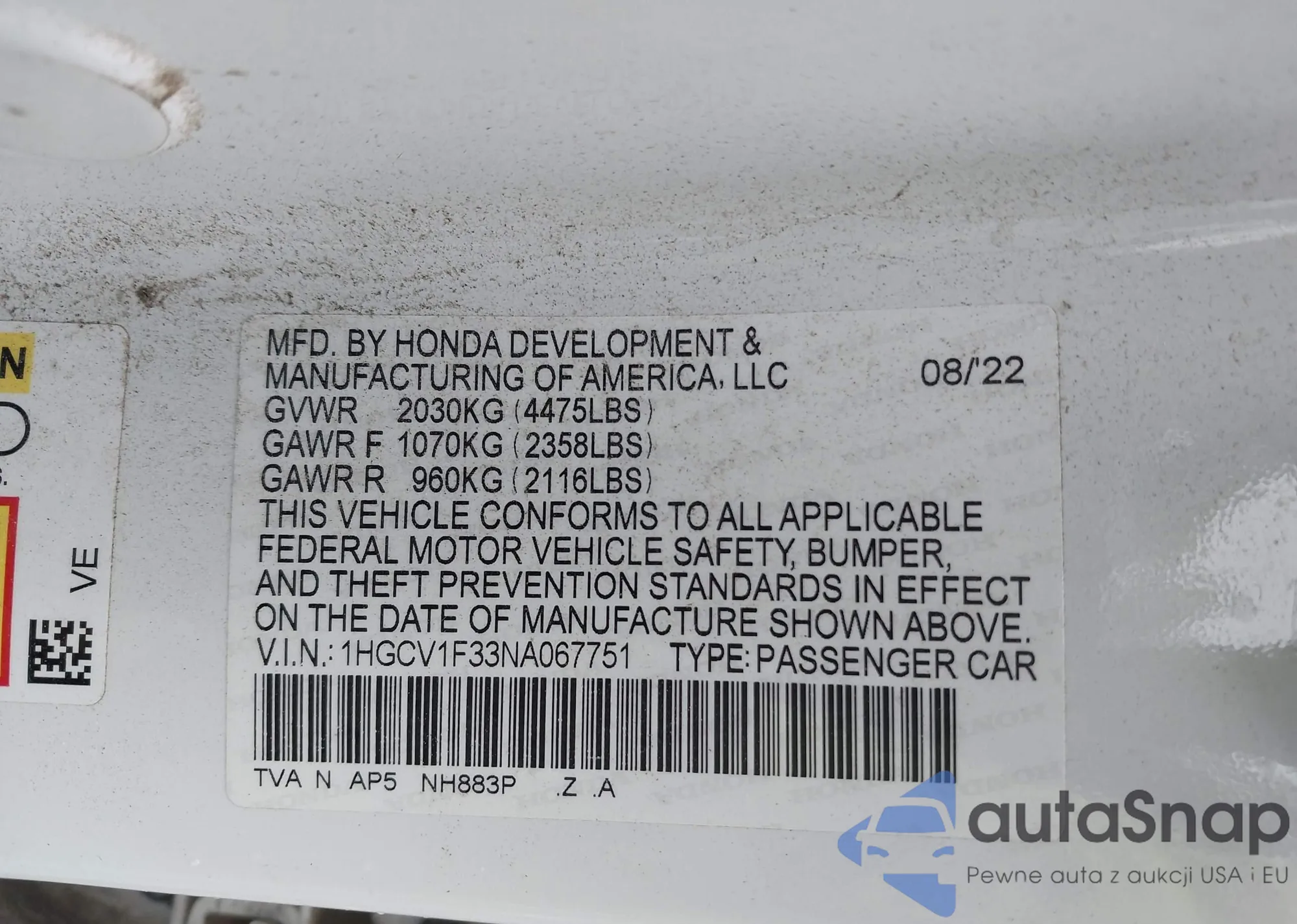 LOT: 43285499 VIN: 1HGCV1F33NA067751